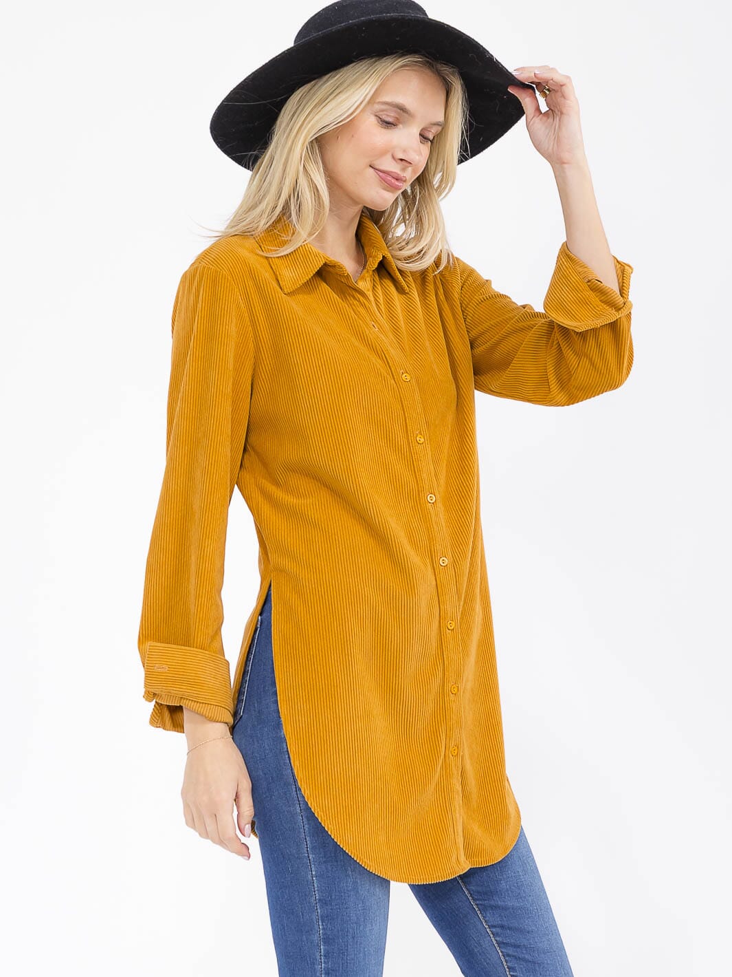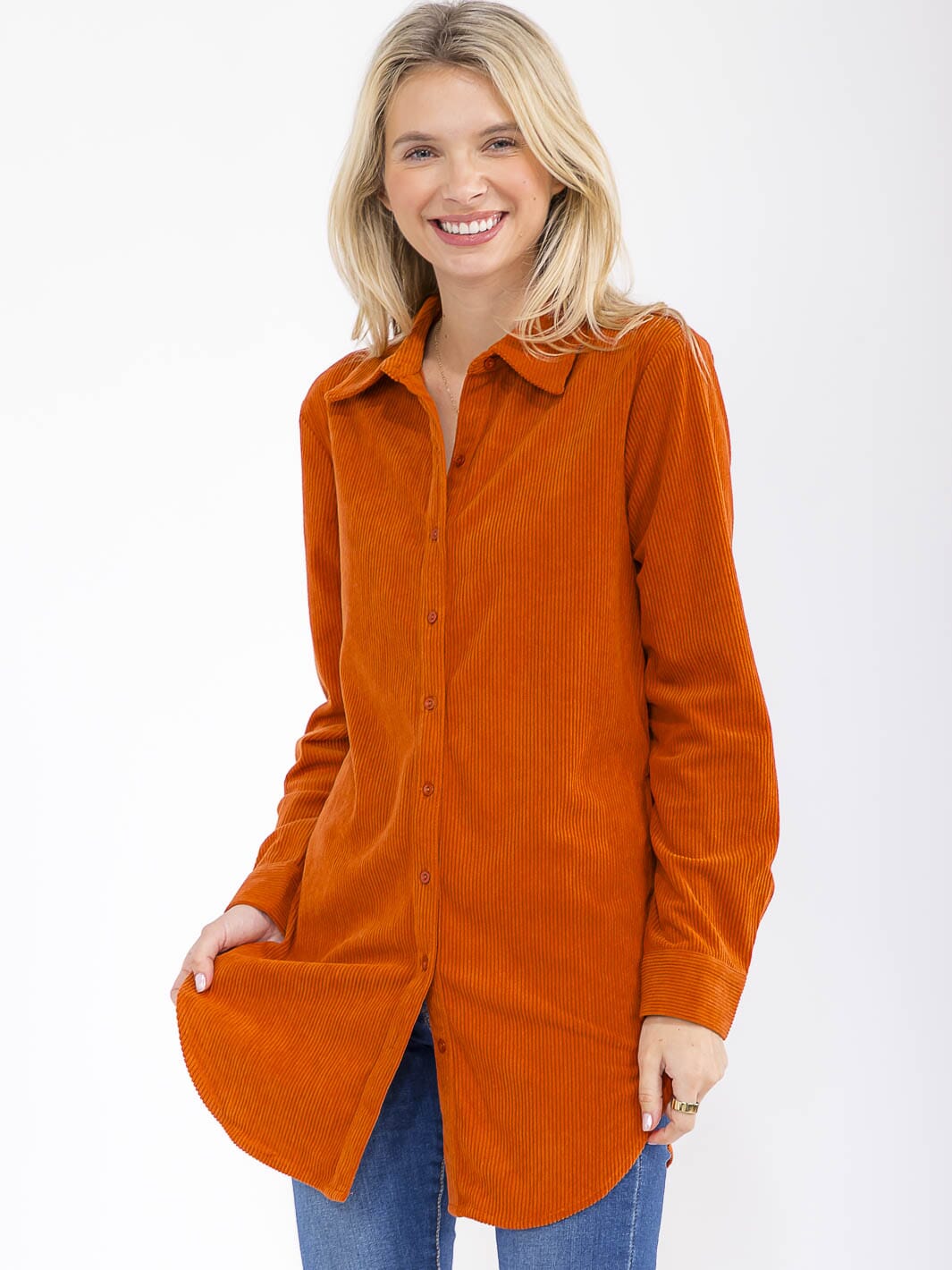 Premium corduroy texture, relaxed button-up fit, lightweight yet cozy for layering, full-length sleeves for versatility, available in must-have shades of mustard and rust, designed for easy pairings year-round, hand-washable for stress-free care.