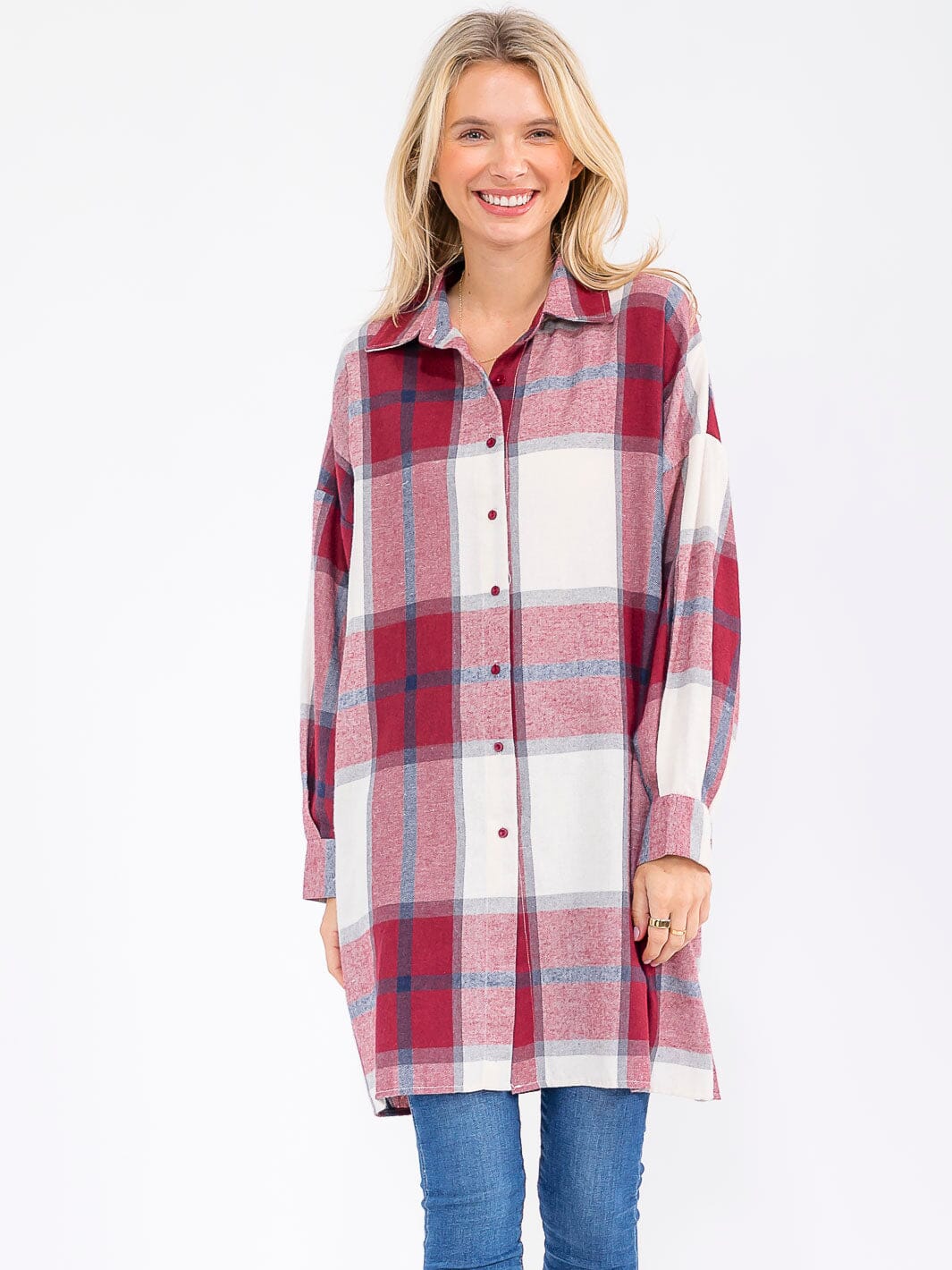 Features:Soft viscose-polyester blend, oversized fit, button-up closure, classic plaid pattern, ideal for layering, seasonless styling, boutique bestseller.