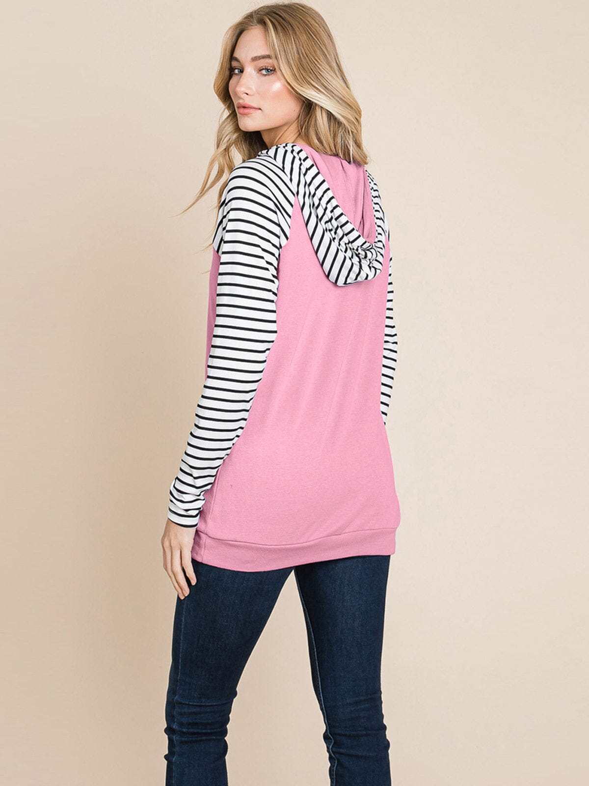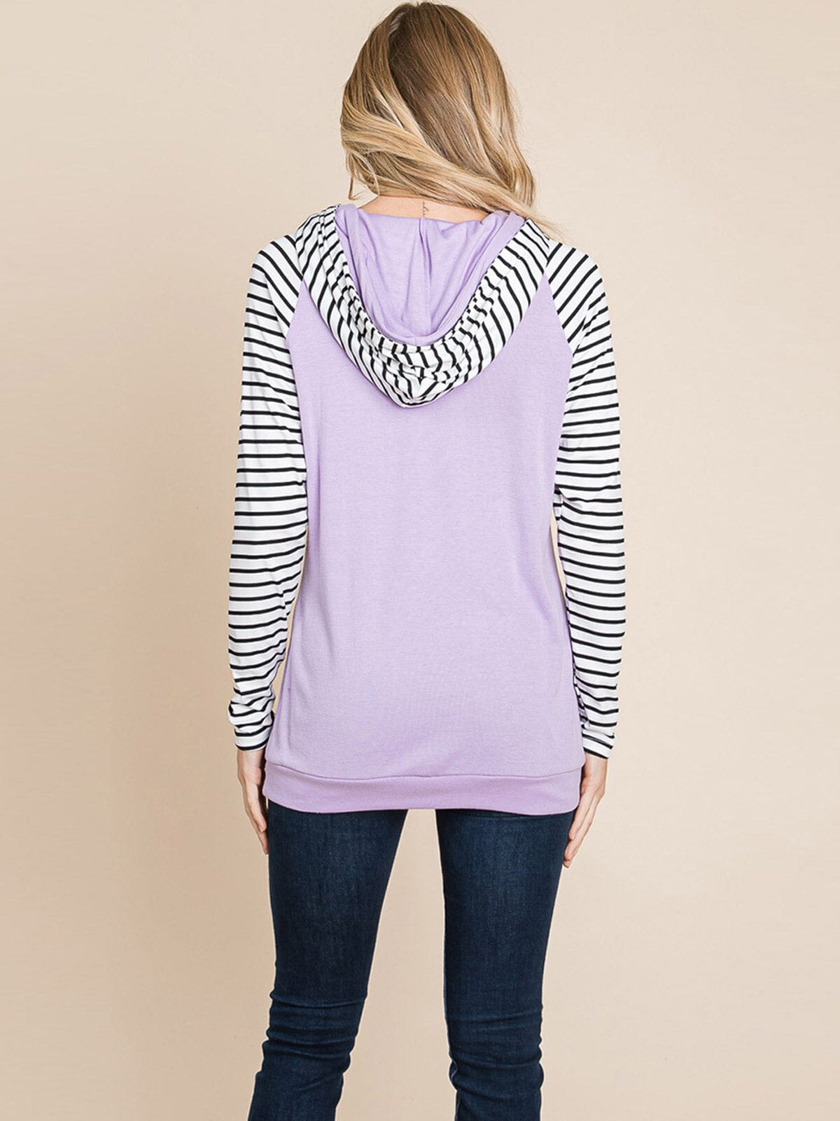 Introducing our must-have Women's Long Sleeve Front Pocket Hooded Stripes Colorblock Top, a trend-forward layering piece that is perfect for retailers. Made with a blend of high-quality materials, this top features a unique colorblock design with stripes, a front pocket, and a comfortable hood. Whether paired with jeans for a casual look or dressed up with a blazer, this top is a versatile addition to any boutique's inventory.