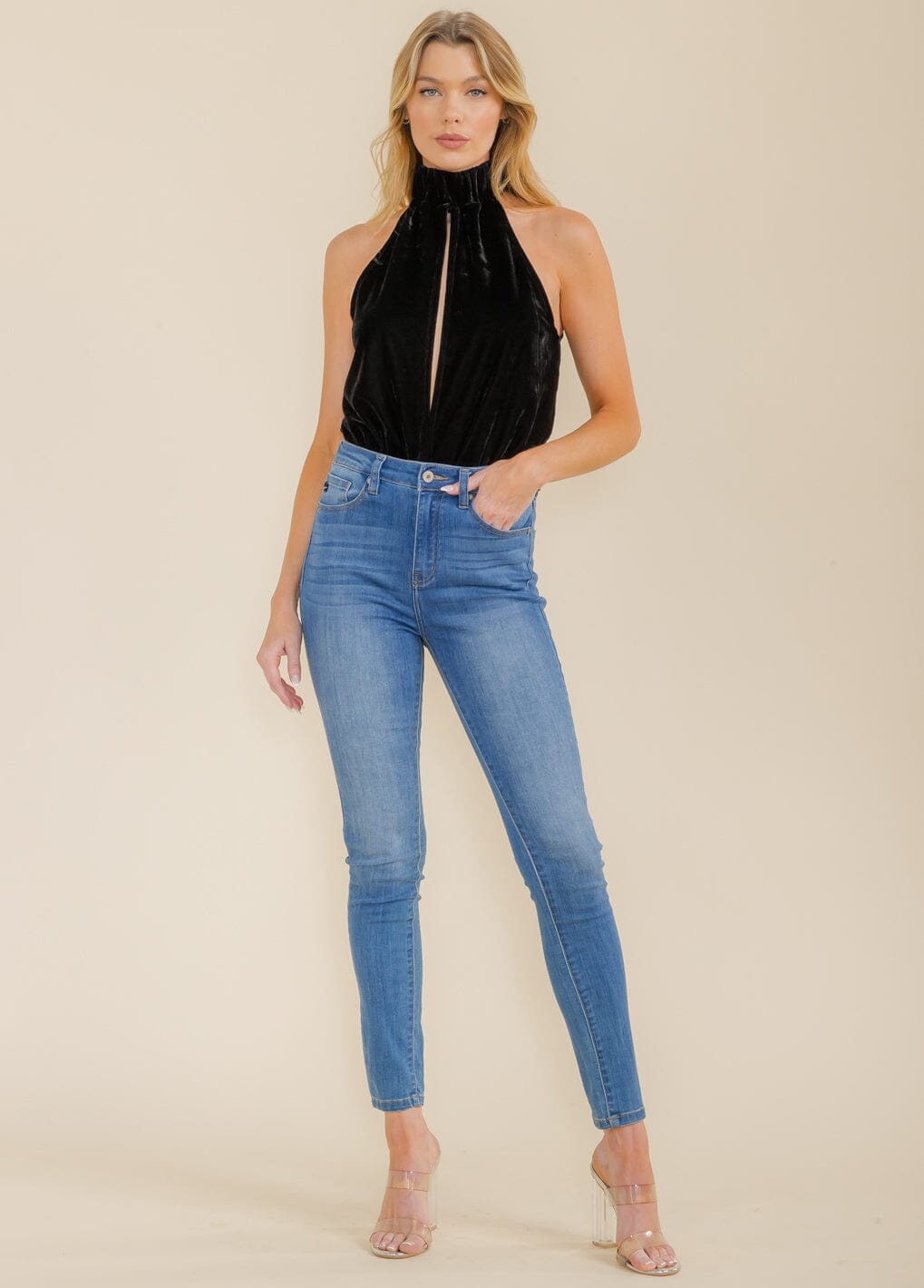 Complete the look:This velvet halter neck bodysuit is a sought-after item due to its versatile design and contemporary appeal. Boutique owners appreciate its high markup potential and ease of restocking due to its reliable seller status. The piece's trend appeal and luxe fabric draw customers in, serving as a focal point in both online and in-store displays, making it an excellent addition to any fashion-forward retail collection.