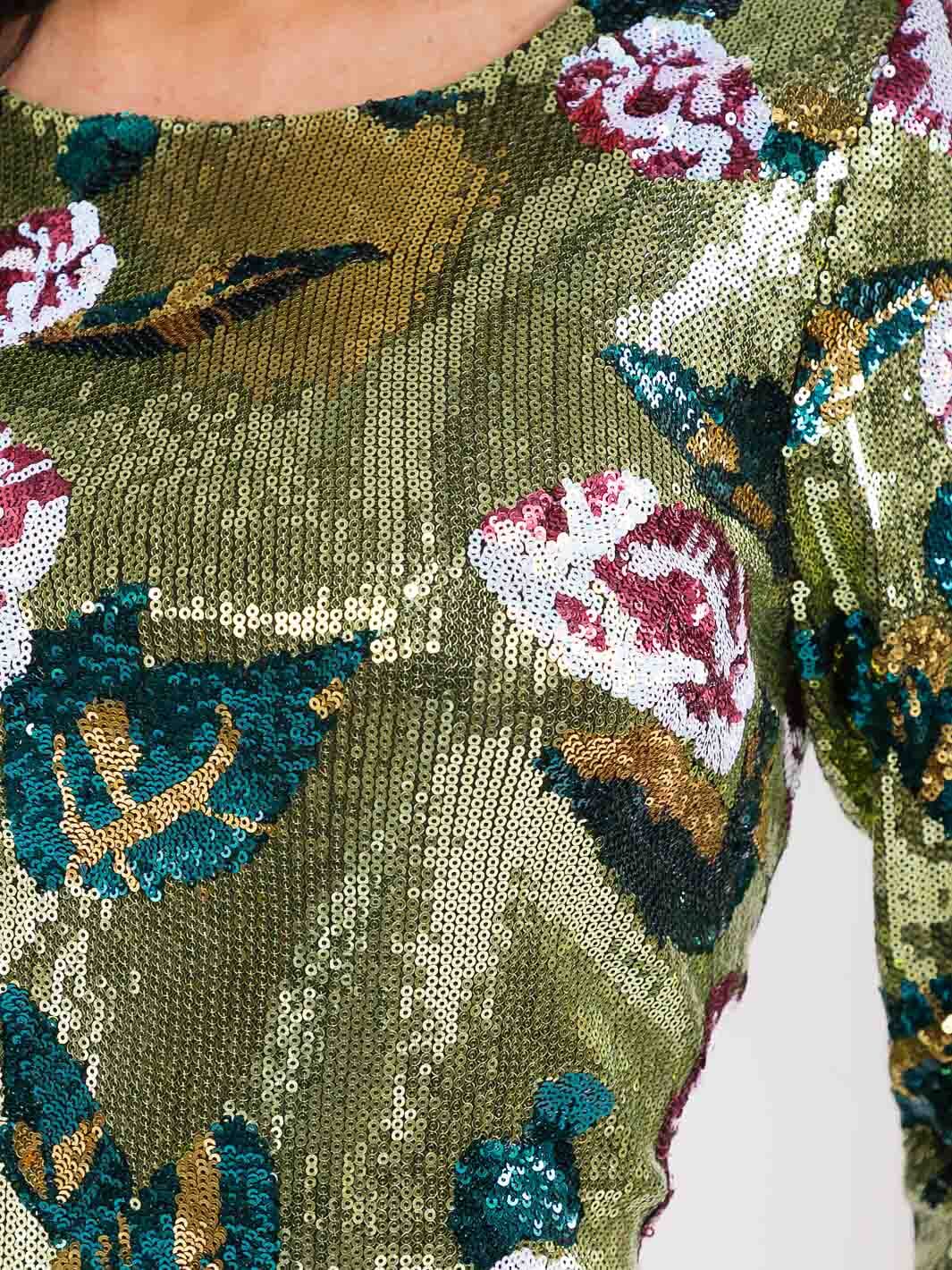Features:Allover floral sequin embellishment, fitted bodycon silhouette, long sleeves for seasonless appeal, soft polyester fabric, above-the-knee mini length, flattering on multiple body types, perfect for event and holiday merchandising