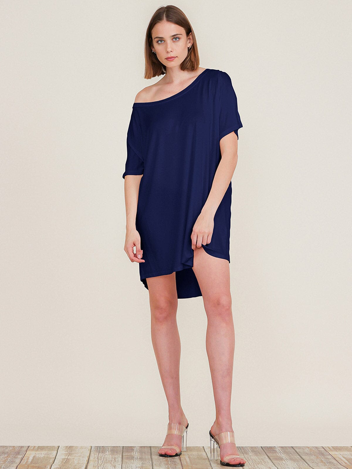 Soft stretch rayon-blend fabric, off-the-shoulder neckline, short sleeves, easy mini length, relaxed tunic silhouette, available in multiple colors, ideal for spring and summer drops