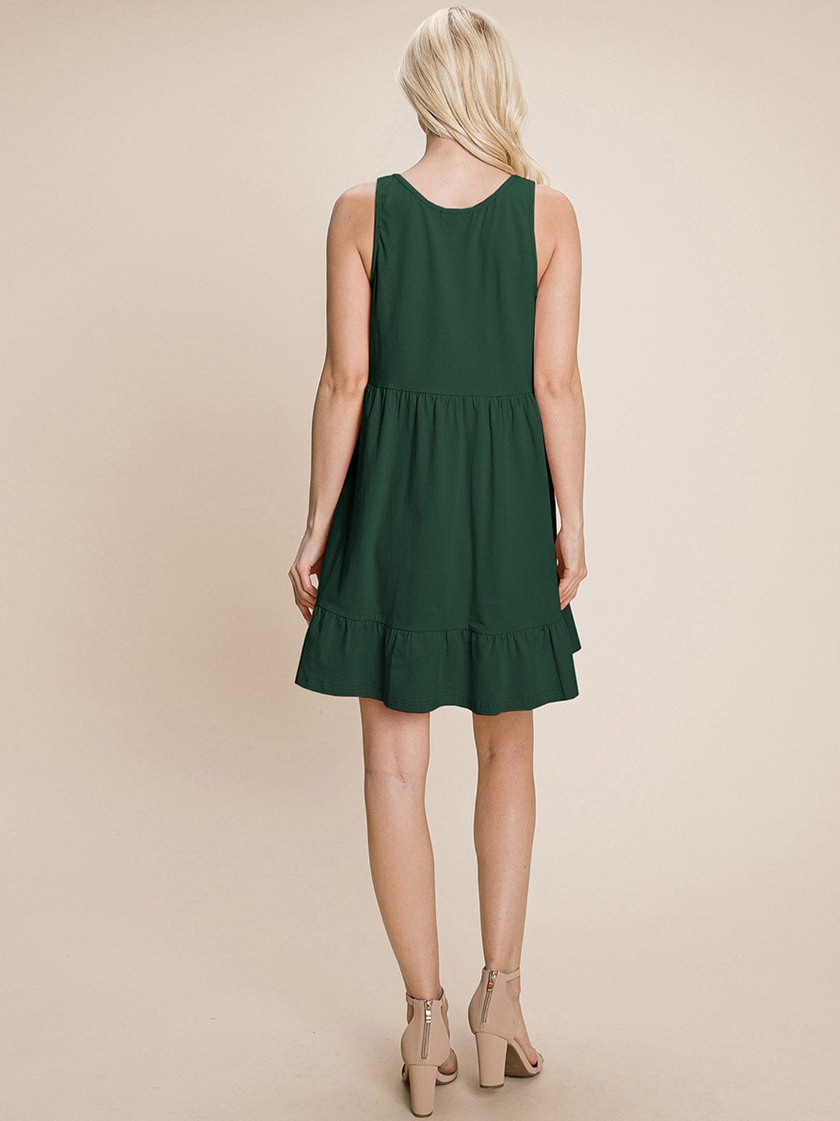 Features:Breathable cotton-spandex fabric, sleeveless silhouette, ruffle bottom hem detail, modern mini dress length, available in peach, hunter green, and black, multiple pack size options, easy-to-style for spring and summer collections
