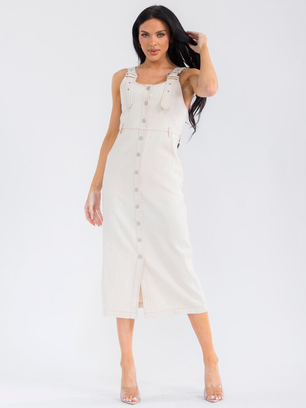 Features:100% cotton fabric, sleeveless design, button-up front, functional pockets, maxi length, versatile styling, breathable comfort.