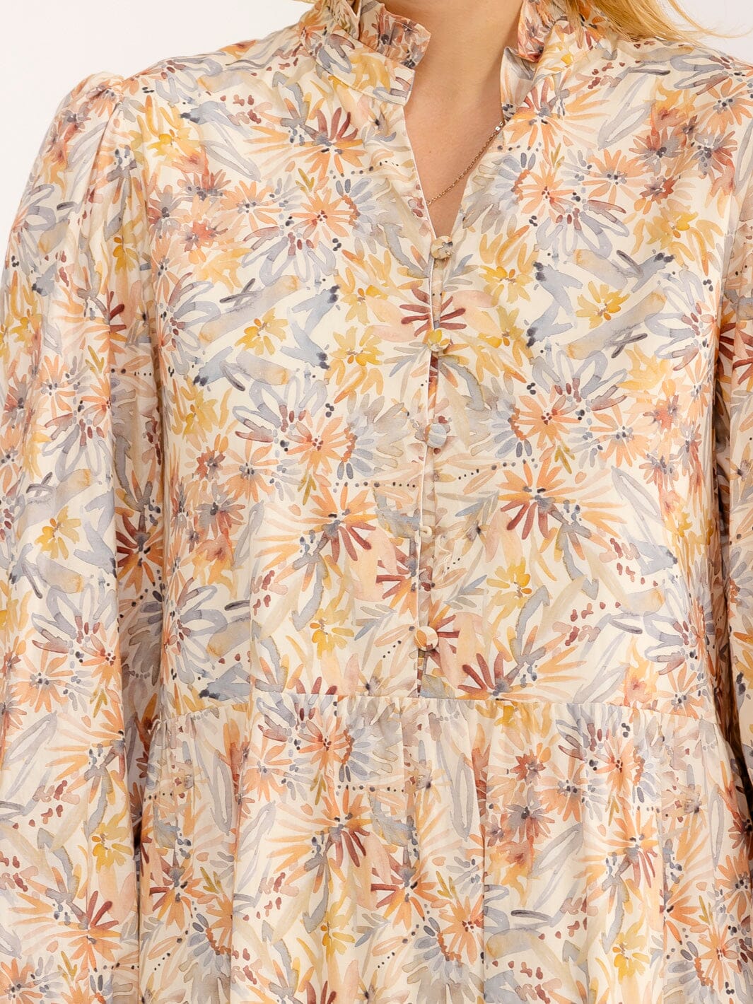 Tiered design, V-neckline, button-up front, 100% cotton with rayon lining, ideal for spring and summer collections, versatile styling, popular with boutiques.