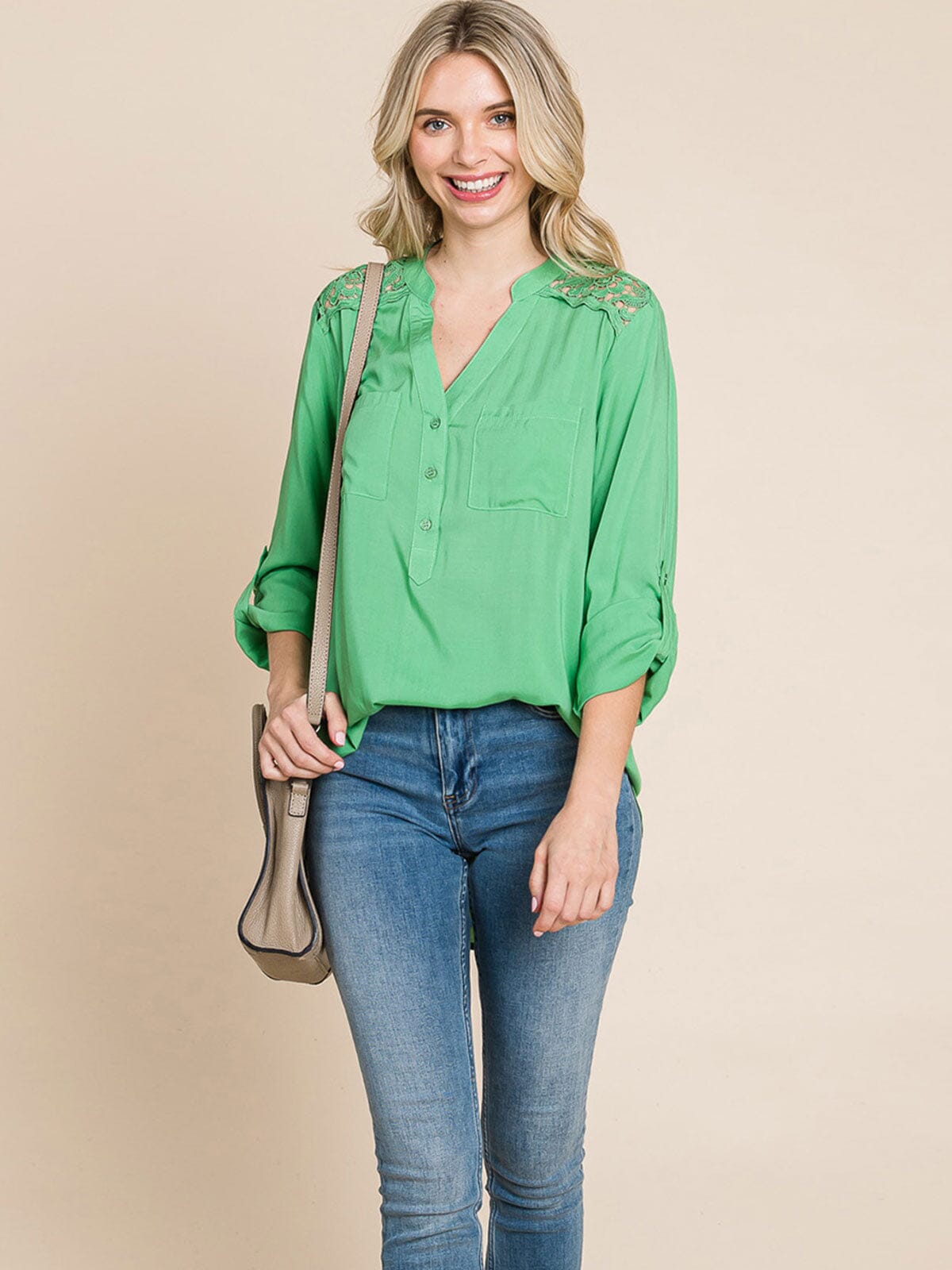 Introducing our best-selling high-low tunic blouse, a must-have for retailers and a trend-forward layering piece for any boutique. Made with 60% cotton and 40% rayon, this V-neck button up blouse features front pockets and long sleeves, making it perfect for any season. The versatile silhouette and comfortable fabric allows for endless styling options, making it a top choice for fashion resellers.
