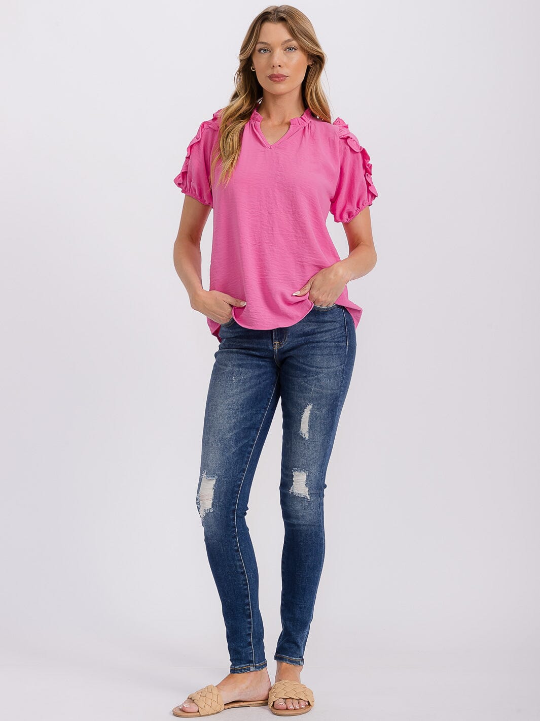 Complete the look:This Short Ruffle Sleeve Blouse is a hit among boutique owners due to its fashionable appeal and versatile design. Its affordable price point and high markup potential make it a lucrative addition to any collection. With its trend-forward design, it guarantees customer satisfaction and frequent reorders, enhancing both in-store displays and online retail offerings.