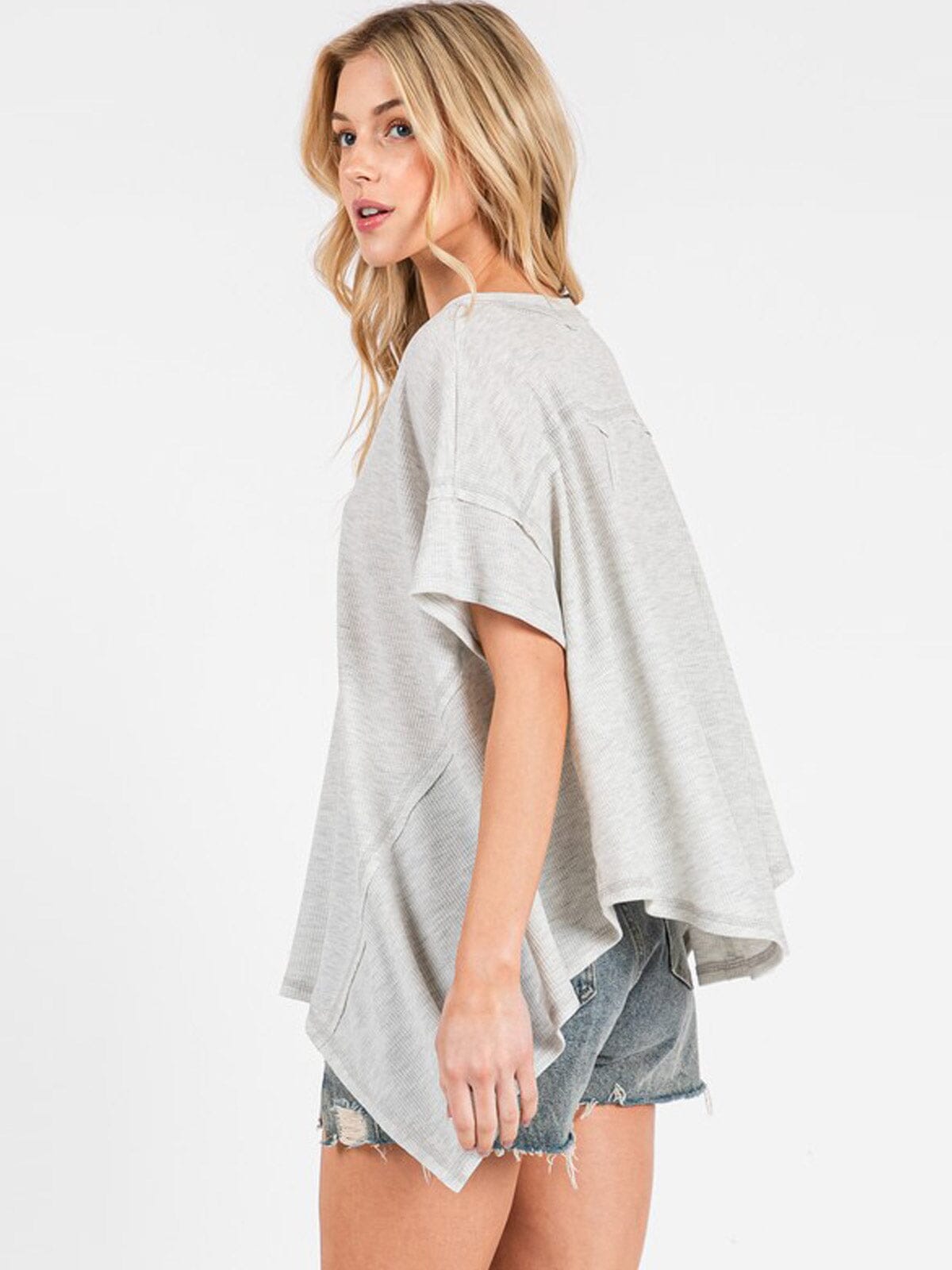 Features:Soft polyester-rayon fabric, relaxed oversized fit, V-neckline, high-low hemline, versatile styling options, made in the USA, perfect for layering.
