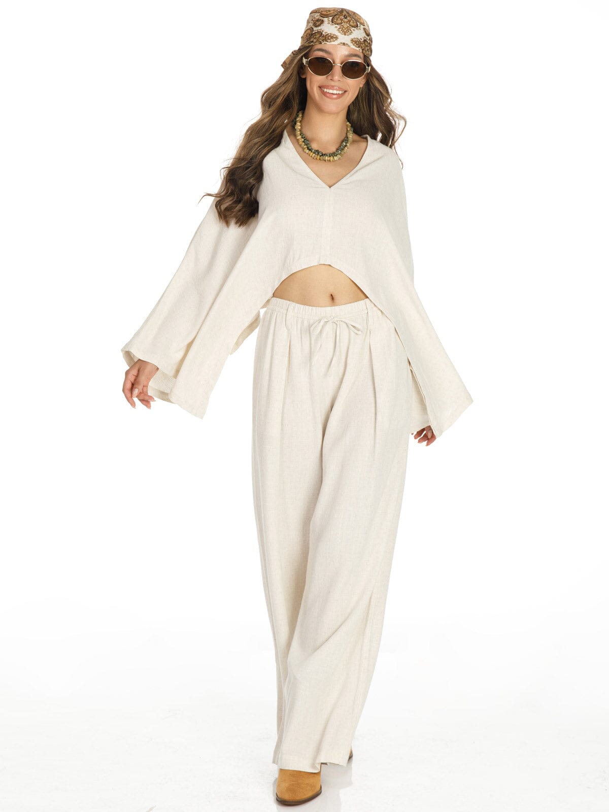 Soft viscose-linen blend, boxy crop top with long sleeves, flattering wide leg pant silhouette, easy hand wash care, breathable and lightweight for spring and summer, pack-friendly for boutique buyers, neutral shades for effortless merchandising.