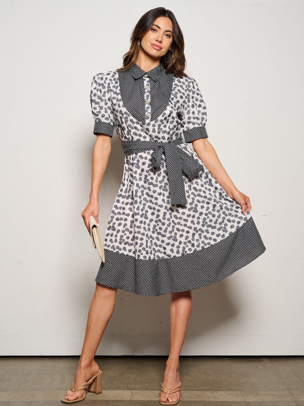 The Women's Short Puff Sleeve Button Up Self Tie Printed Midi Dress is a trendy and versatile piece that is perfect for boutique owners looking to offer their customers a unique and stylish option. Made with 100% polyester, this dress is both lightweight and comfortable, making it a must-have for retailers. The puff sleeves and self-tie detail add a touch of femininity, while the midi length and button-up design give it a classic and sophisticated silhouette. This dress is a bestseller with boutiques and a trend-forward layering piece that can be styled in a variety of ways, making it a popular choice for fashion resellers.