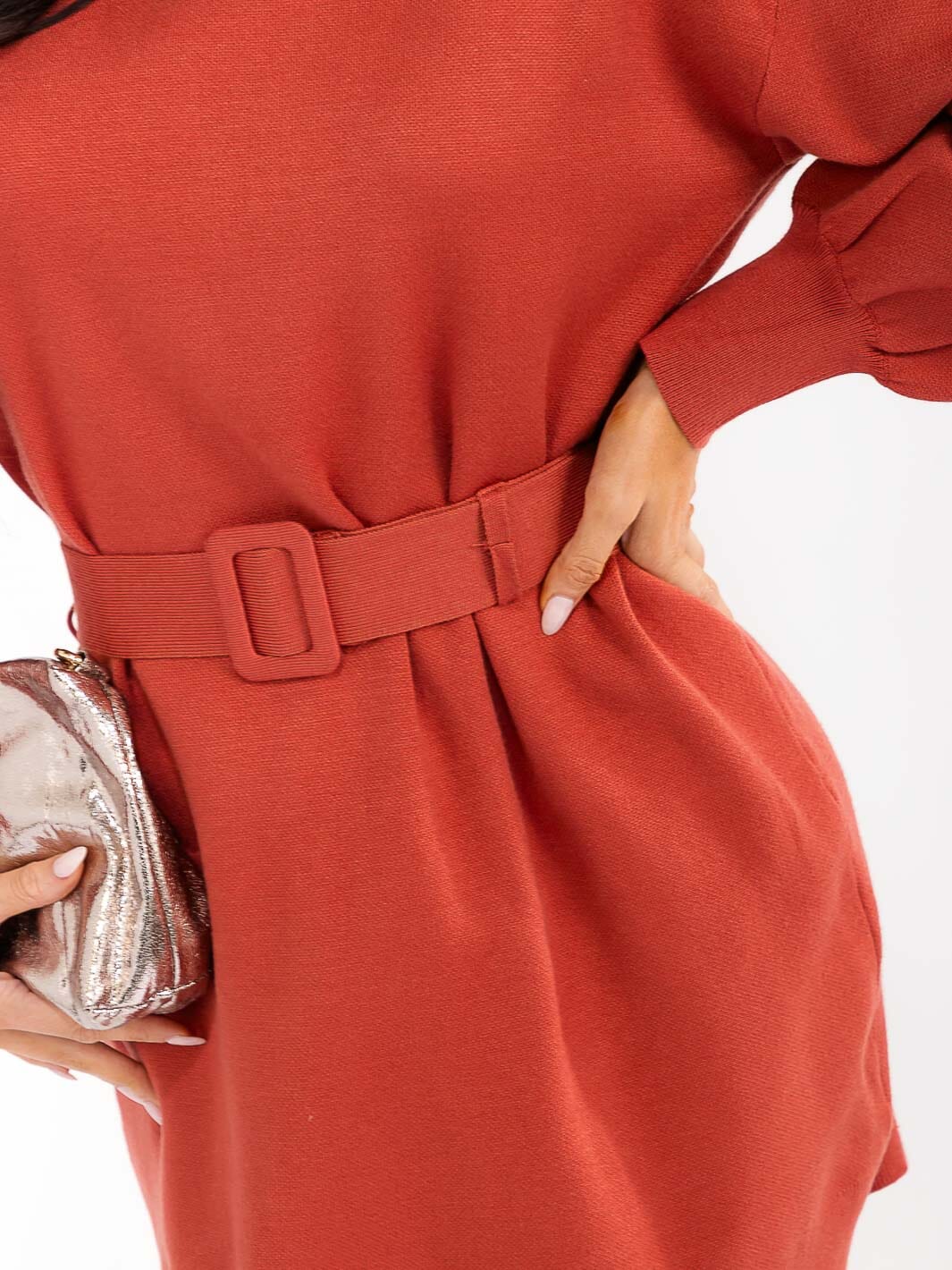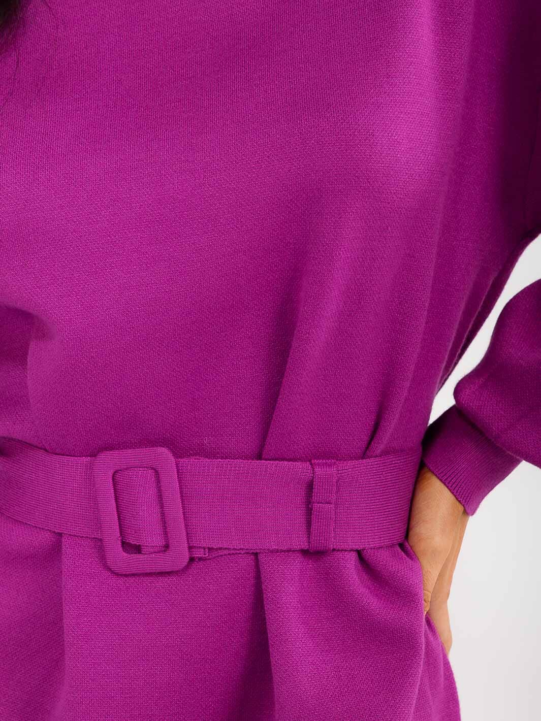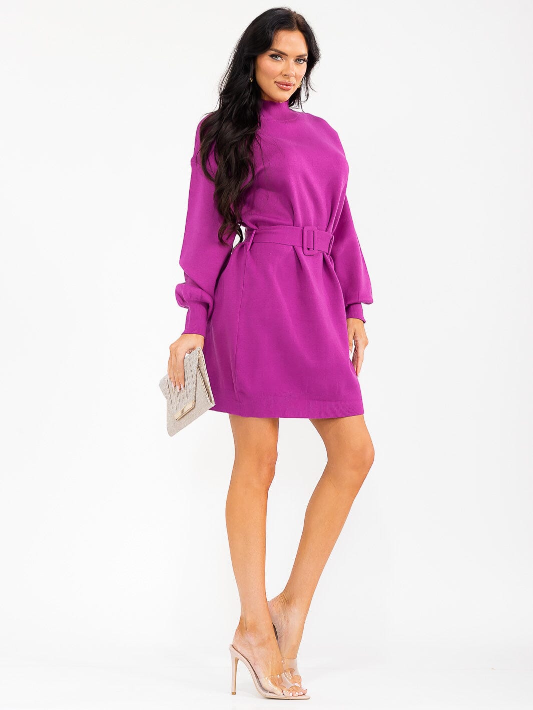 Soft viscose-blend knit fabric, flattering mini-length cut, adjustable waist belt for customizable fit, modern mock neck detail, long sleeves for year-round appeal, available in trending colors rust and purple, easy-care hand wash.
