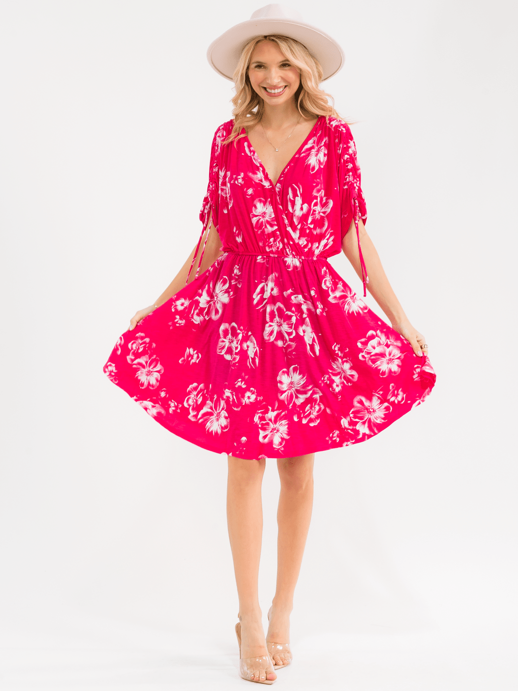 Features:Floral design, elastic waist for a comfortable fit, mini dress silhouette, versatile styling for day and night, made with lightweight polyester-spandex blend, ideal for spring and summer collections, popular choice among boutiques.