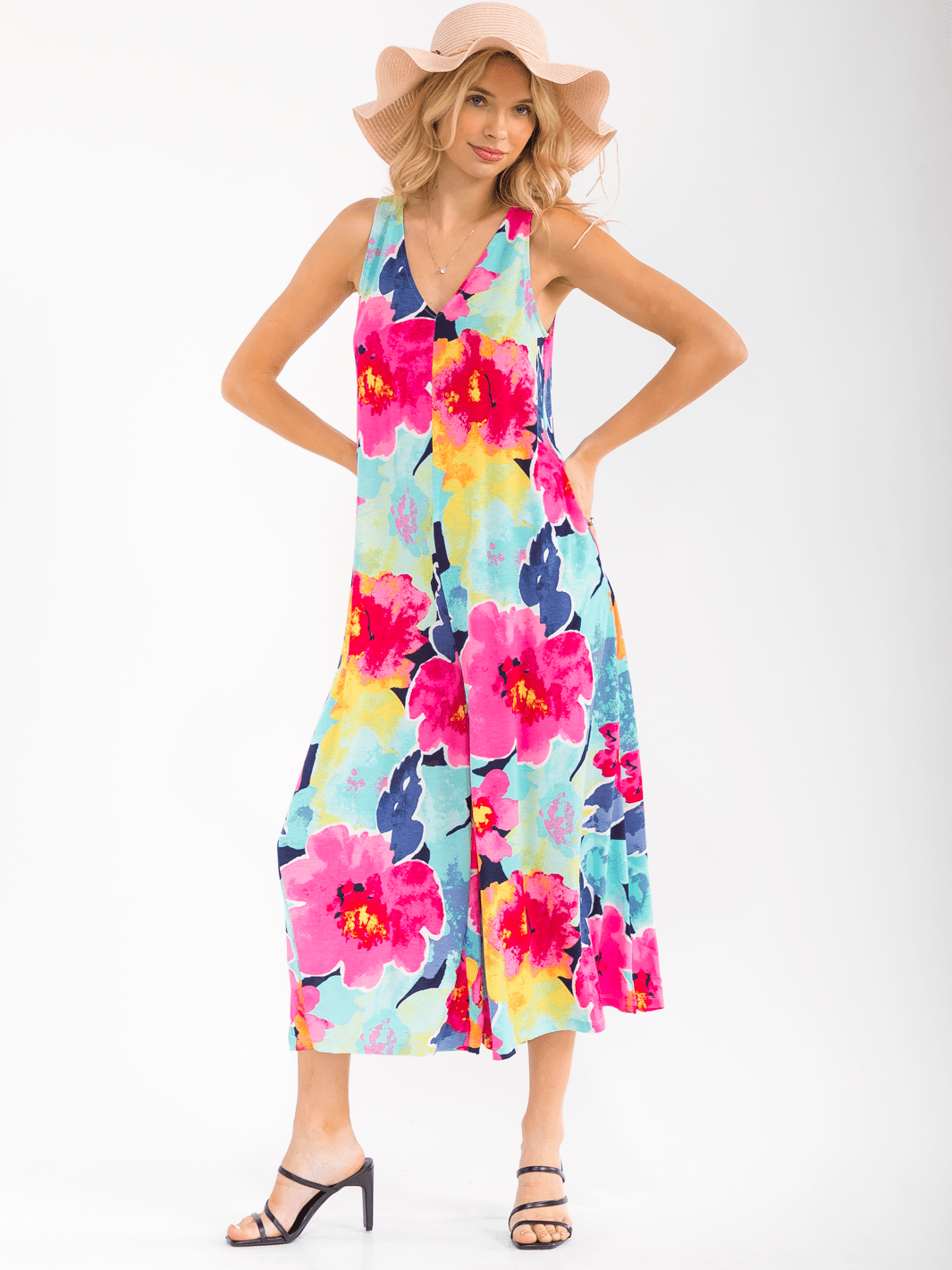 Features:Lightweight polyester-spandex fabric, wide-leg cropped silhouette, sleeveless v-neckline, front functional pockets, comfortable stretch fit, easy to dress up or down, bestselling floral print for boutiques