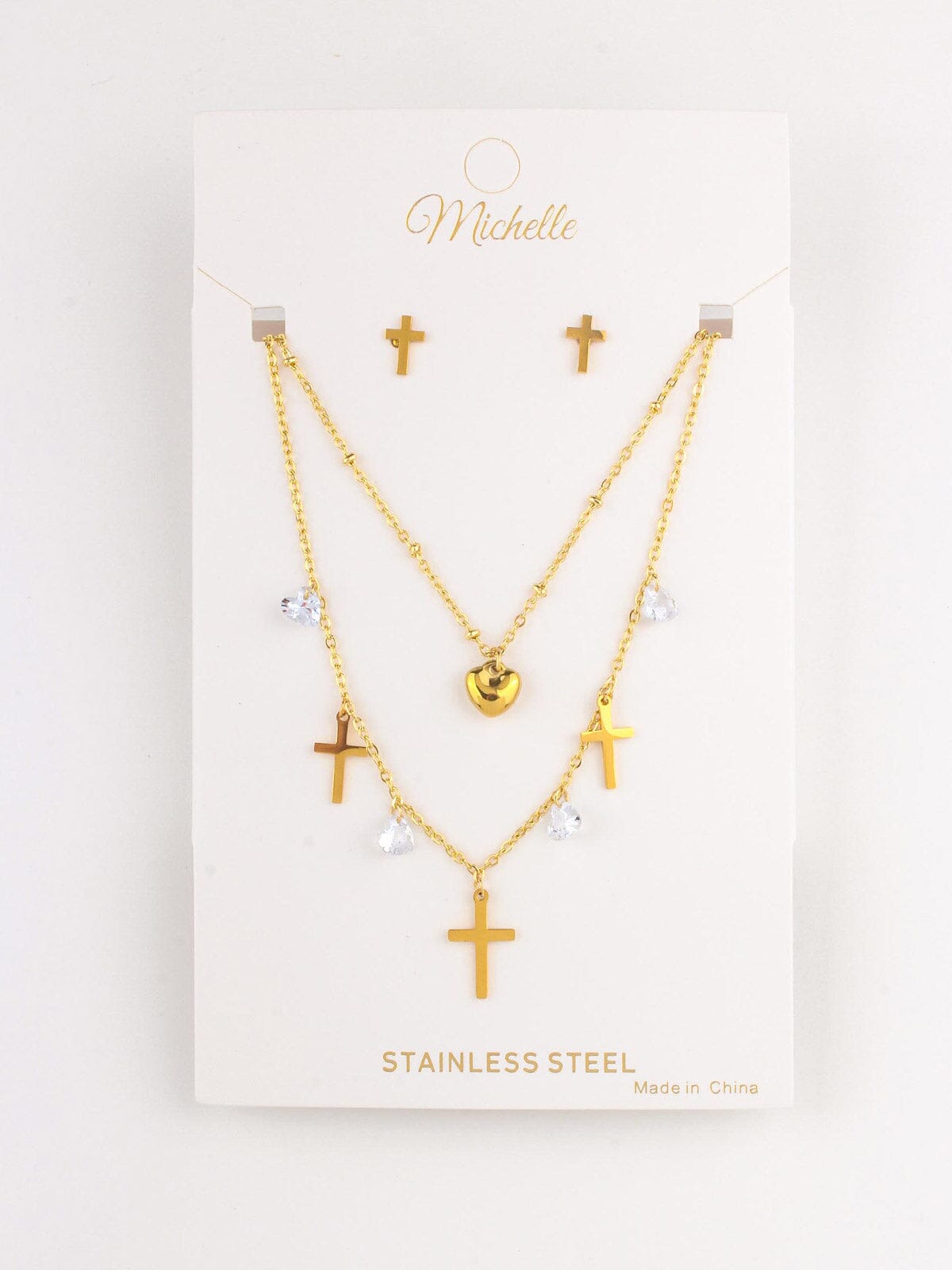 WOMEN'S STAINLESS STEEL CROSS & HEART EARRINGS & NECKLACE SET