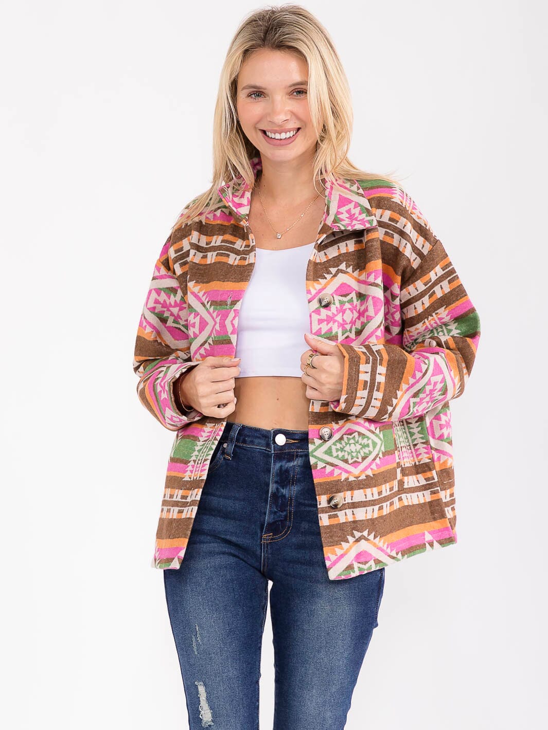 Features:100% polyester fabric, easy button-front closure, relaxed fit with dropped shoulders, functional front pockets, versatile styling over tees or sweaters, ideal for fall and winter collections, standout multi-print design, comfortable for all-day wear