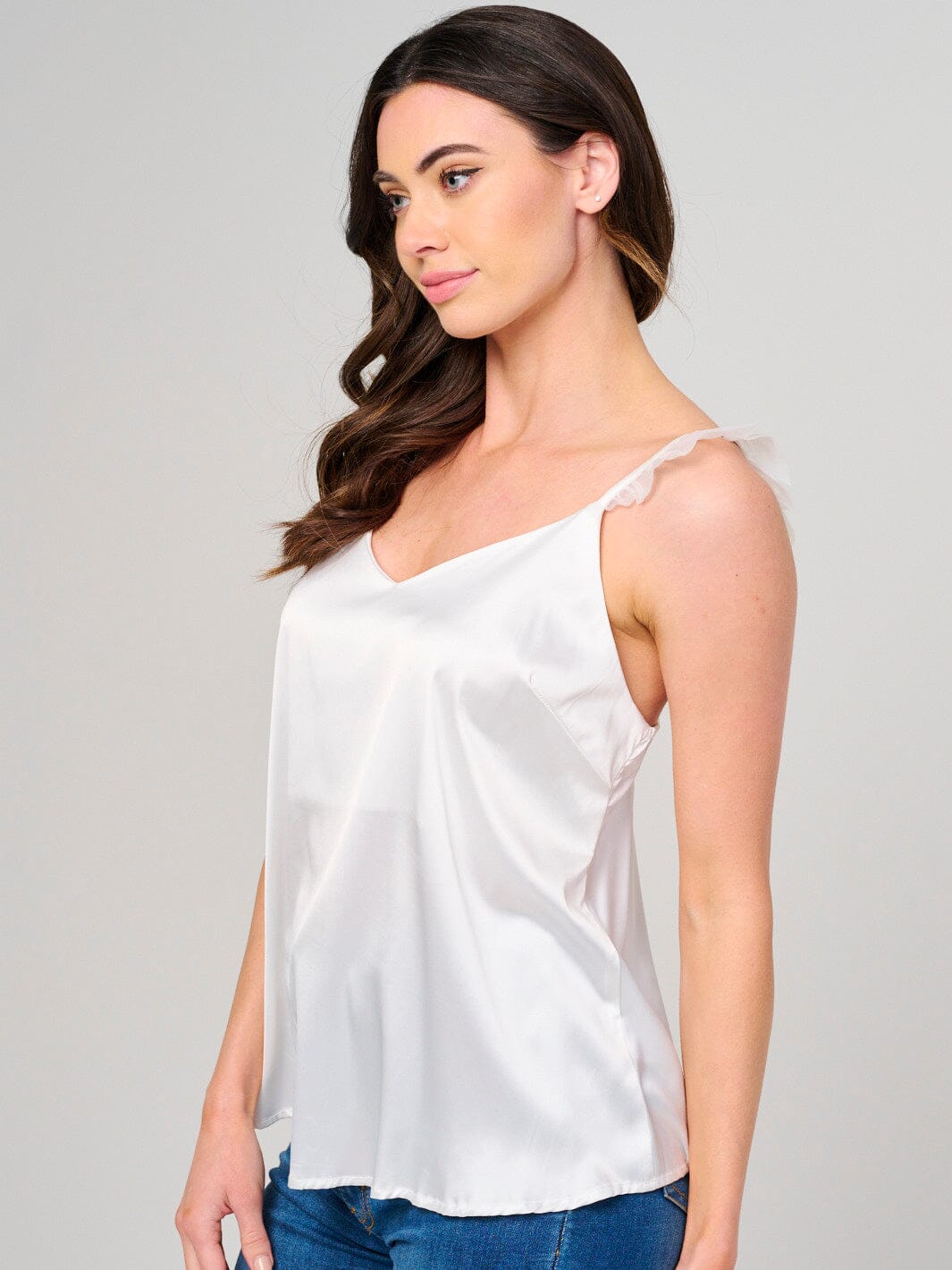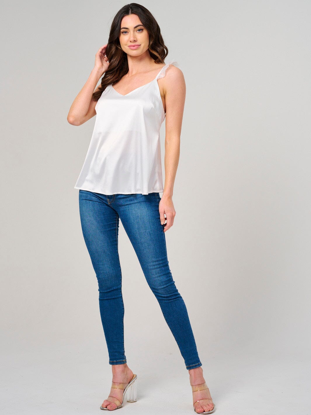 Complete the look:This chic satin V-neck tank top is a favorite among boutique owners for its high markup potential and trend appeal. Its versatile design ensures it fits seamlessly into any collection, driving repeat sales and attracting fashion-forward customers. With reliable reorder availability and eye-catching display options, it’s a smart choice for both in-store and online retail success.