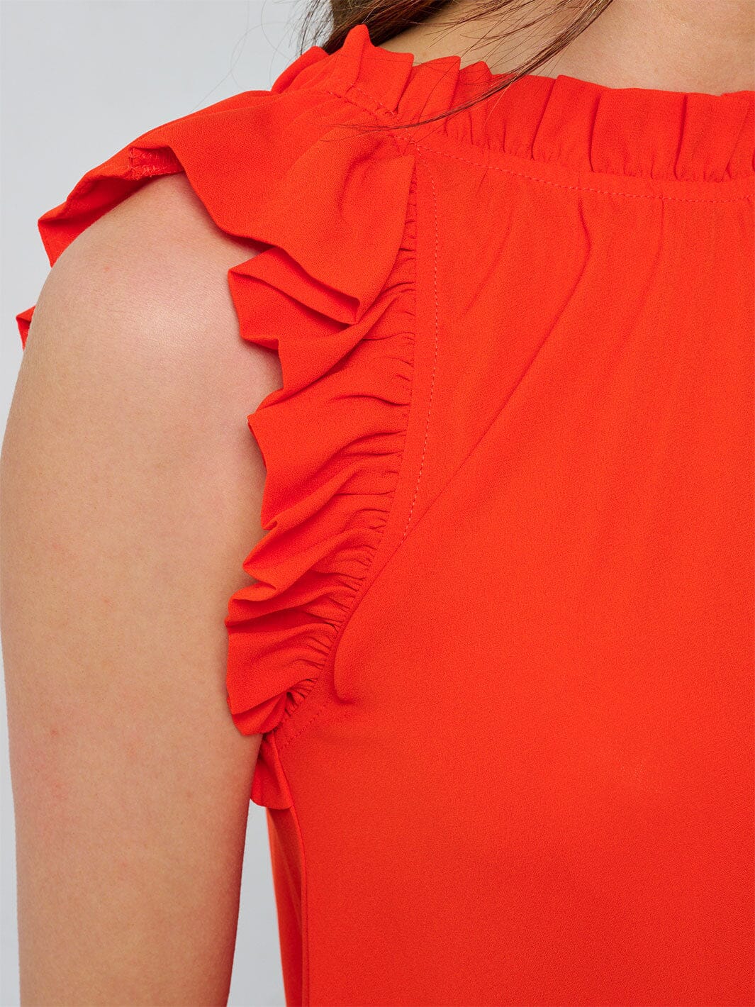 Ruffle sleeves, neck trim detailing, flowy cut, 100% polyester, hand washable