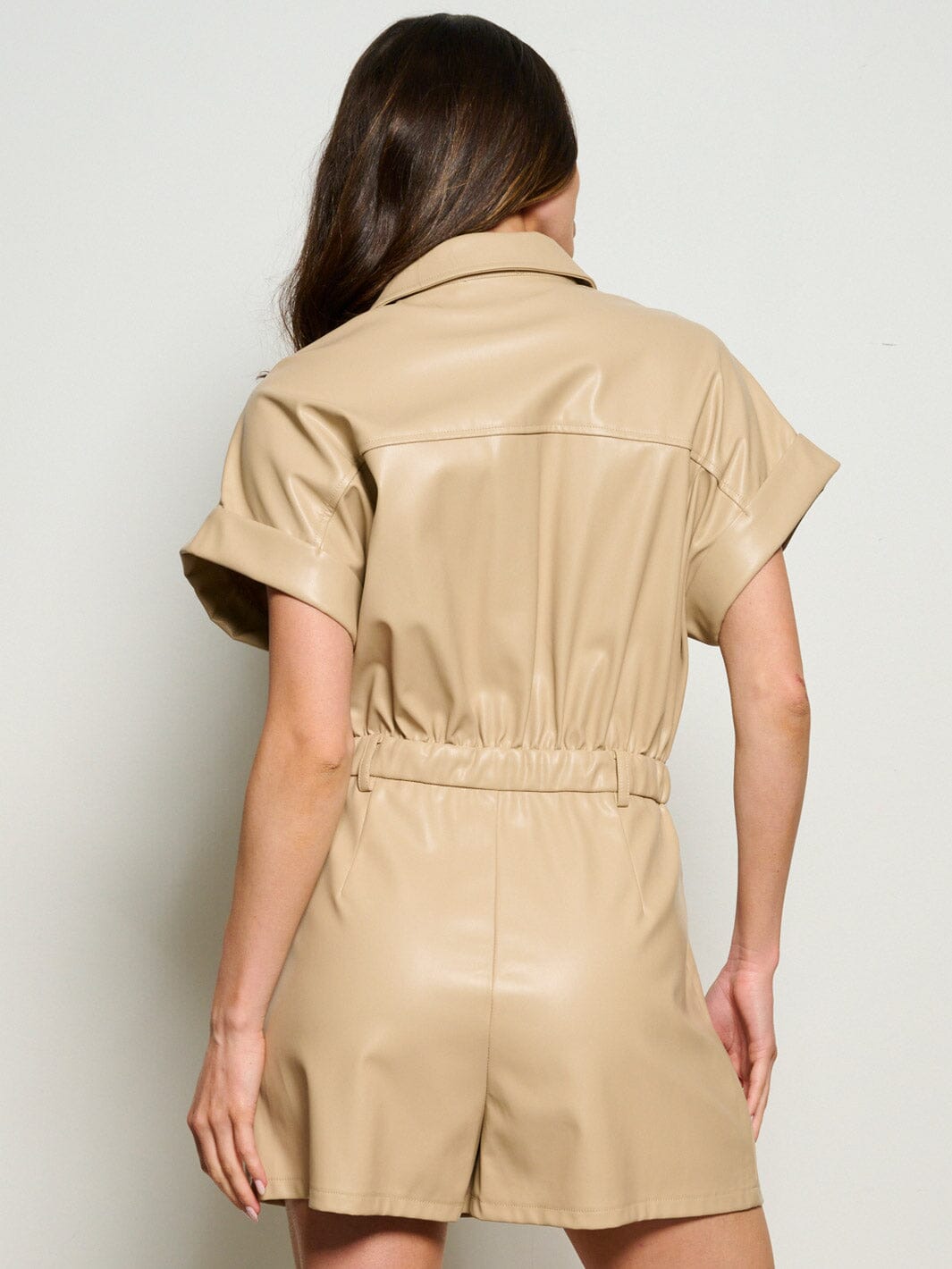 WOMEN'S SHORT SLEEVE BUTTON UP POCKETS PU PLEATHER ROMPER