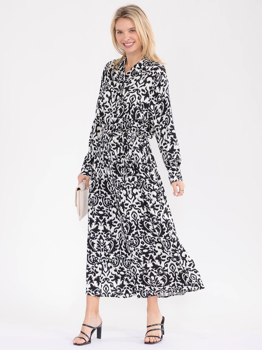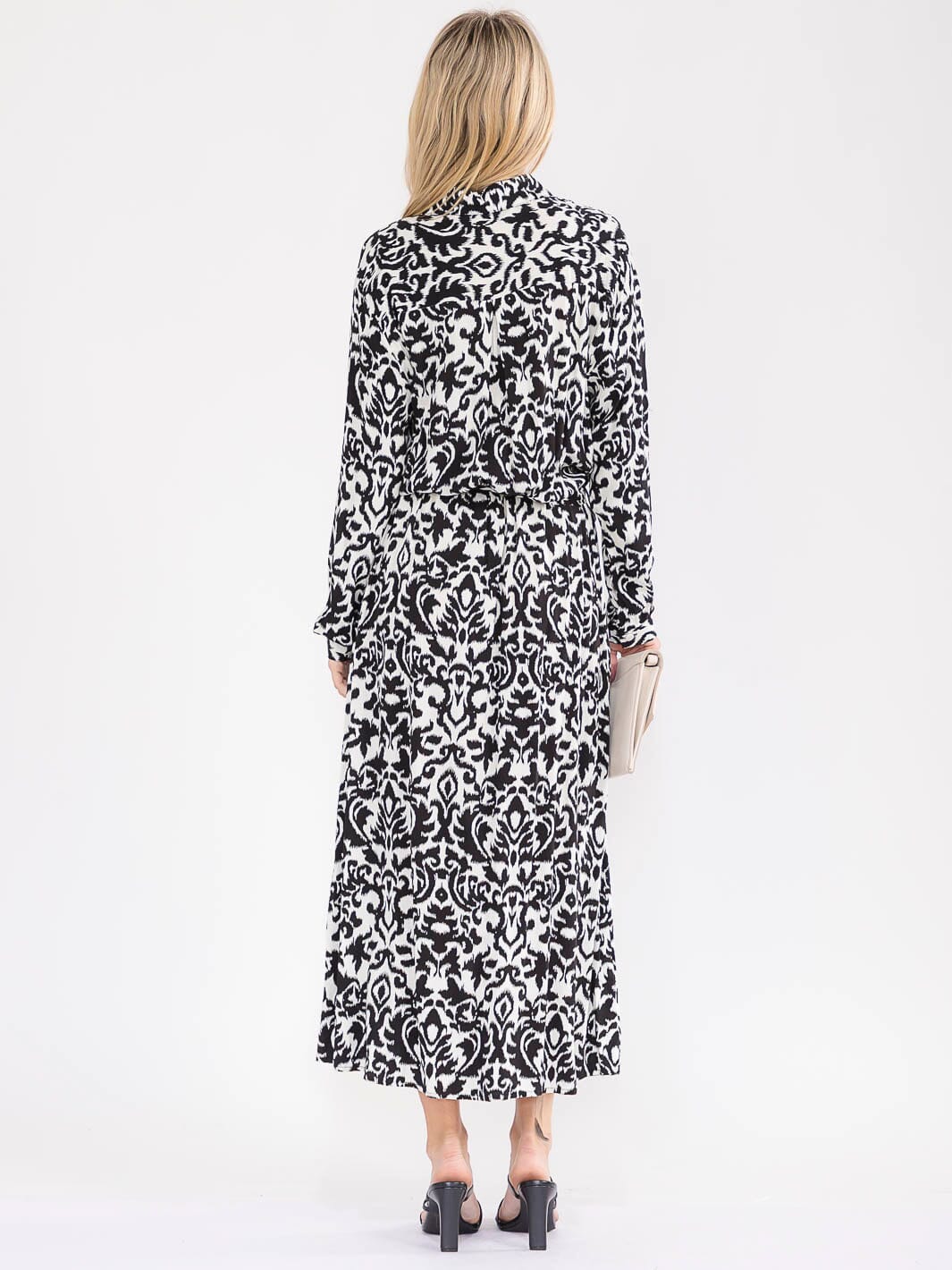 Introducing our Women's Button-Up Maxi Dress with Self-Tie and Multi-Print design, a trend-forward piece perfect for any contemporary fashion collection. This maxi boasts a flattering silhouette with its long sleeves and versatile tie-waist, crafted from a breathable cotton-polyester blend. Ideal for effortless day-to-night transitions, this dress is a must-have for modern boutiques aiming to captivate their clientele with chic elegance.