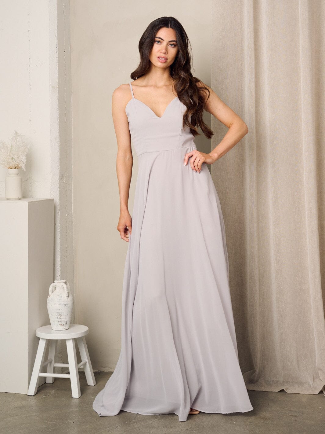 WOMEN'S SLEEVELESS V-NECK BACK RUFFLE TIE MAXI GOWN DRESS