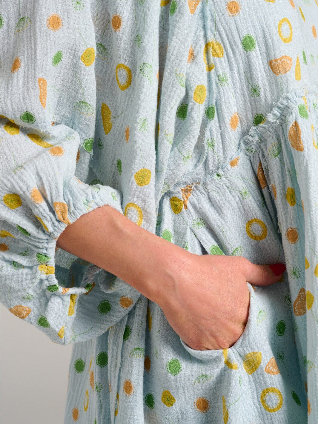100% Rayon fabric, Long sleeve, Pockets, Printed design, Mini length, Versatile styling options, Flattering silhouette
