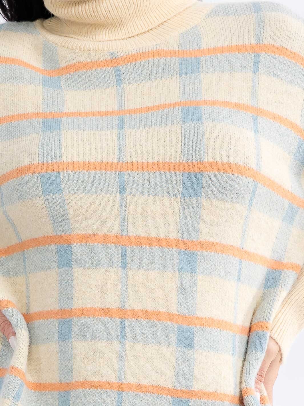 Features:Colorblock design, soft knit fabric, versatile styling options, perfect for fall and winter, flattering mini length, ideal for layering, eye-catching turtleneck.