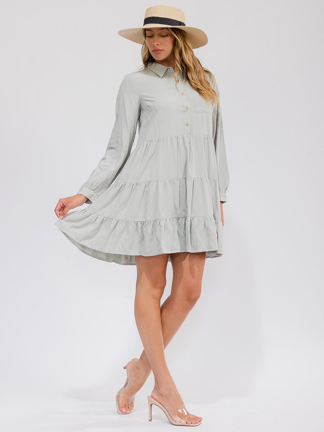 The Must-Have Women's Long Sleeve Front Pocket Button Up Tiered Loose Fit Mini Dress is a versatile piece that can easily transition from day to night. Crafted from a luxurious blend of rayon and tencel, this dress offers a flowy and comfortable silhouette. With a button-up front, front pockets, and tiered design, this dress is on-trend and perfect for any season. Style it with strappy heels and statement jewelry for a chic and effortless look. This dress is a bestseller with boutiques and a must-have for retailers looking to offer their customers a trend-forward layering piece.