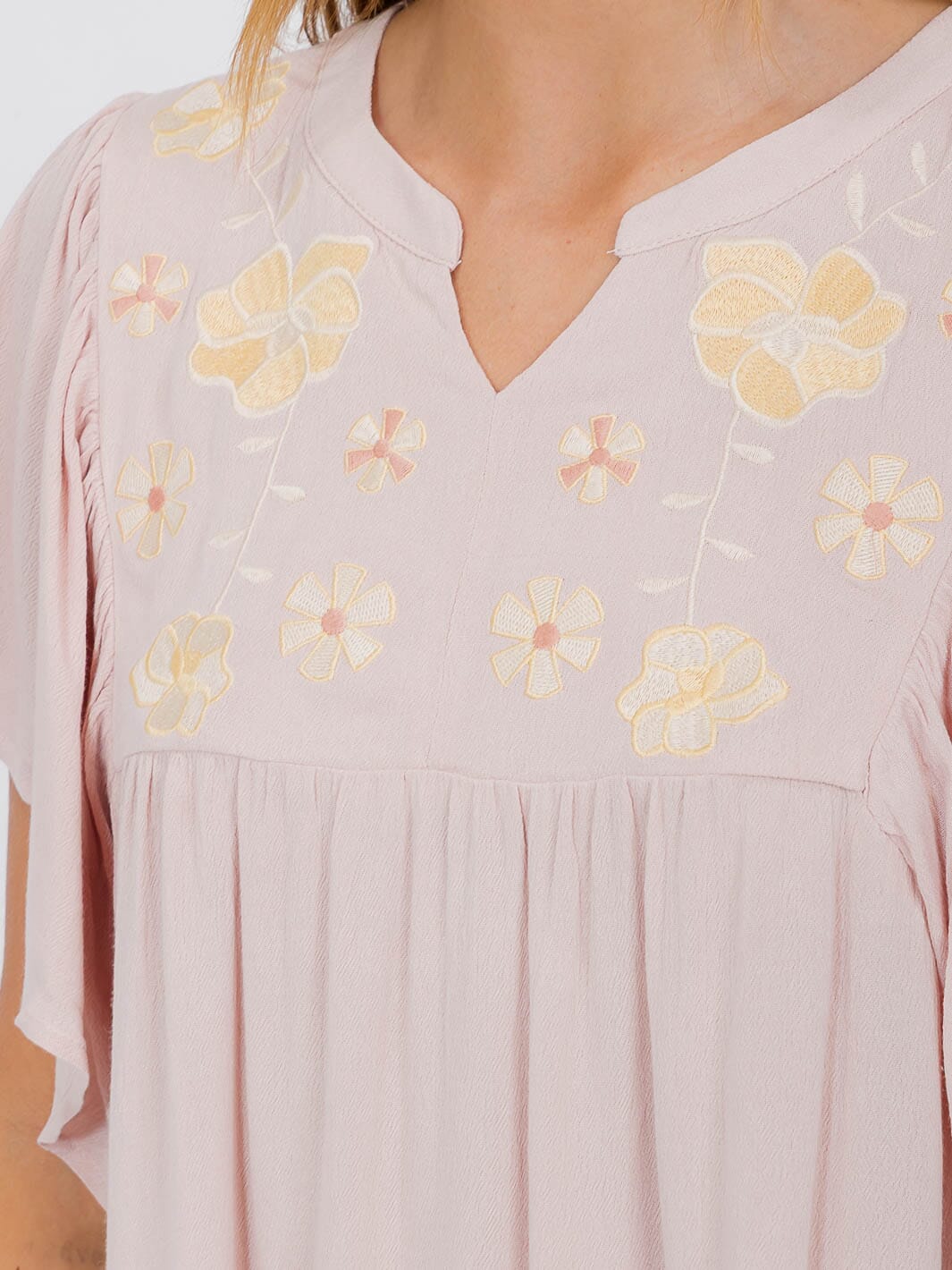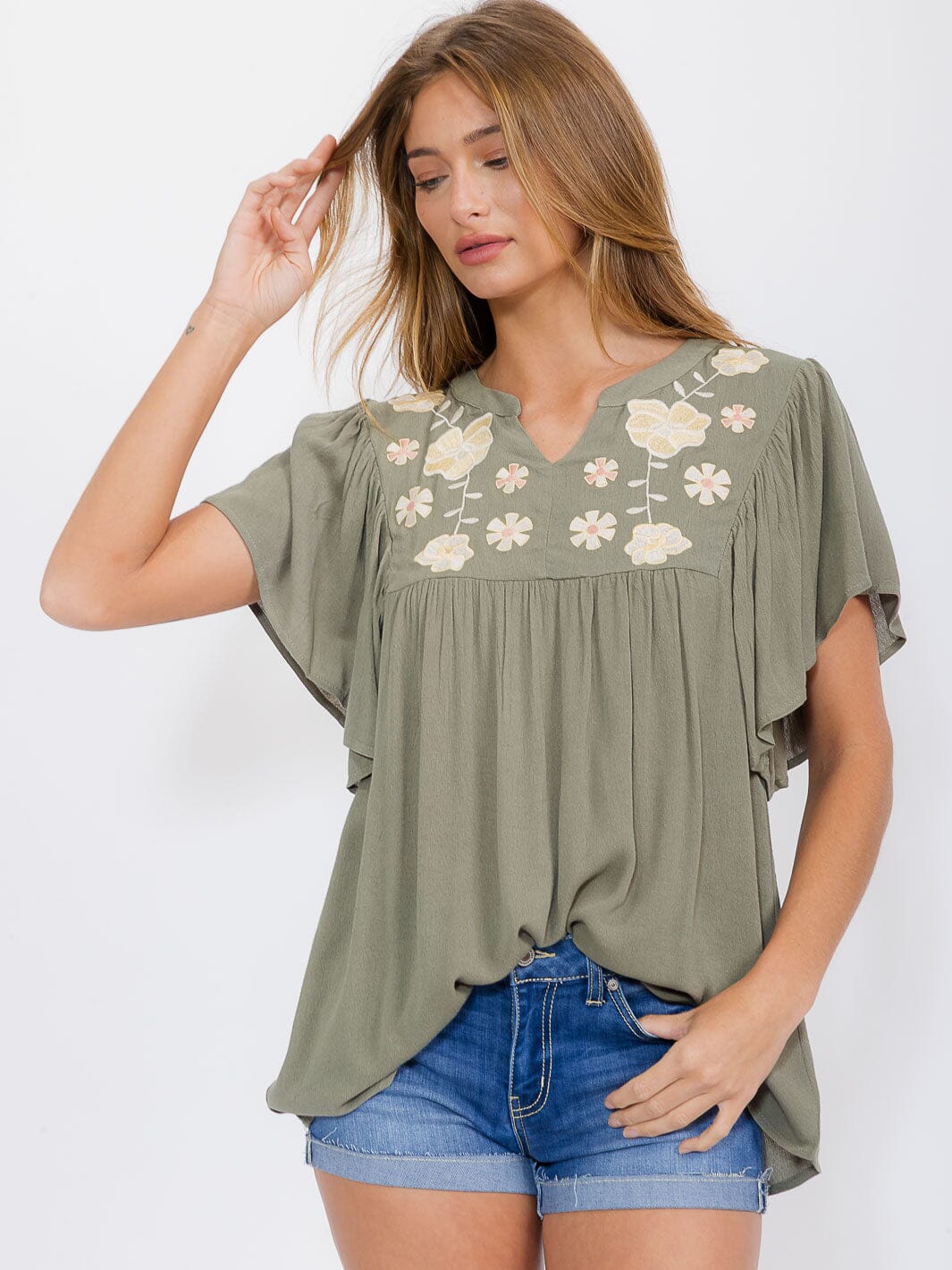 Introducing the perfect addition to your boutique's collection - this versatile and stylish short ruffle sleeve blouse with intricate flower embroidery details. Made with 100% rayon, this blouse offers both comfort and style, making it a must-have for any fashion-forward woman. Whether you're heading to brunch, a resort vacation, or just want a casual yet chic look, this blouse has got you covered.