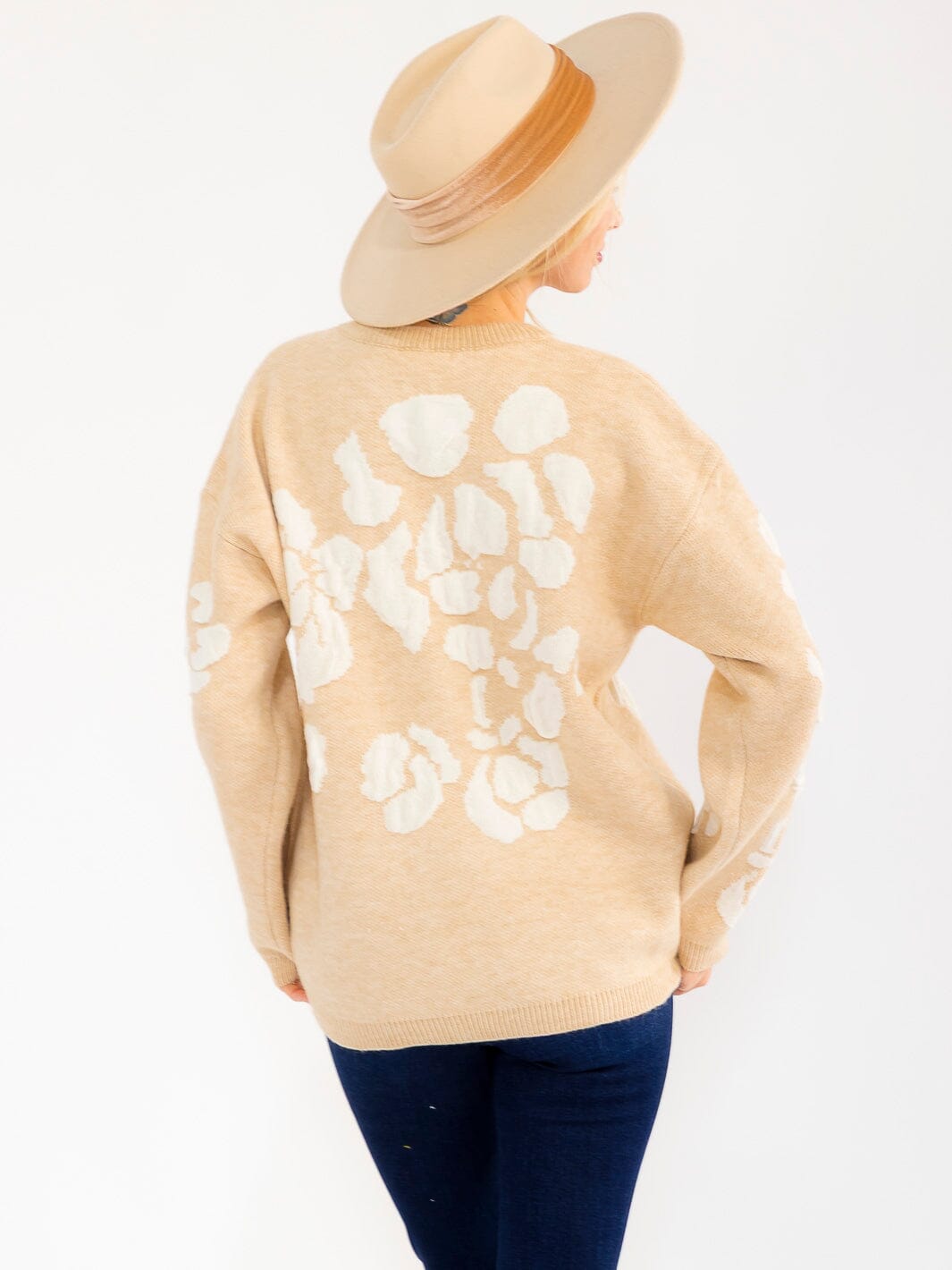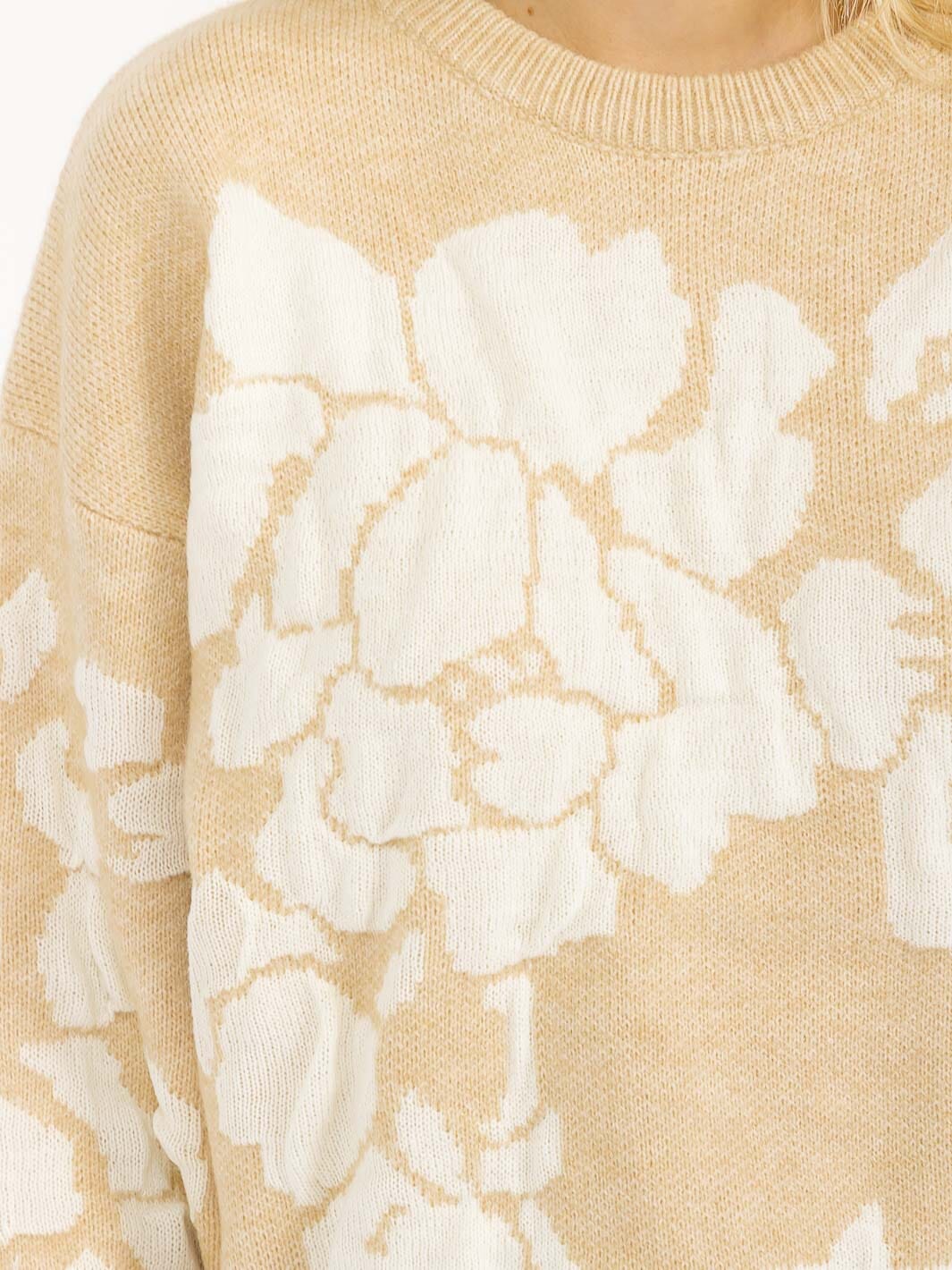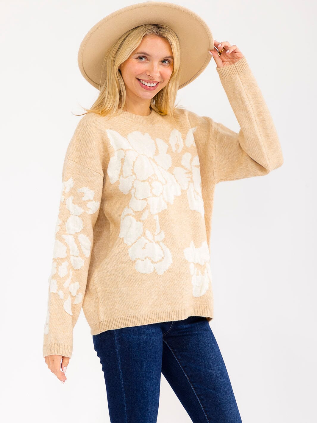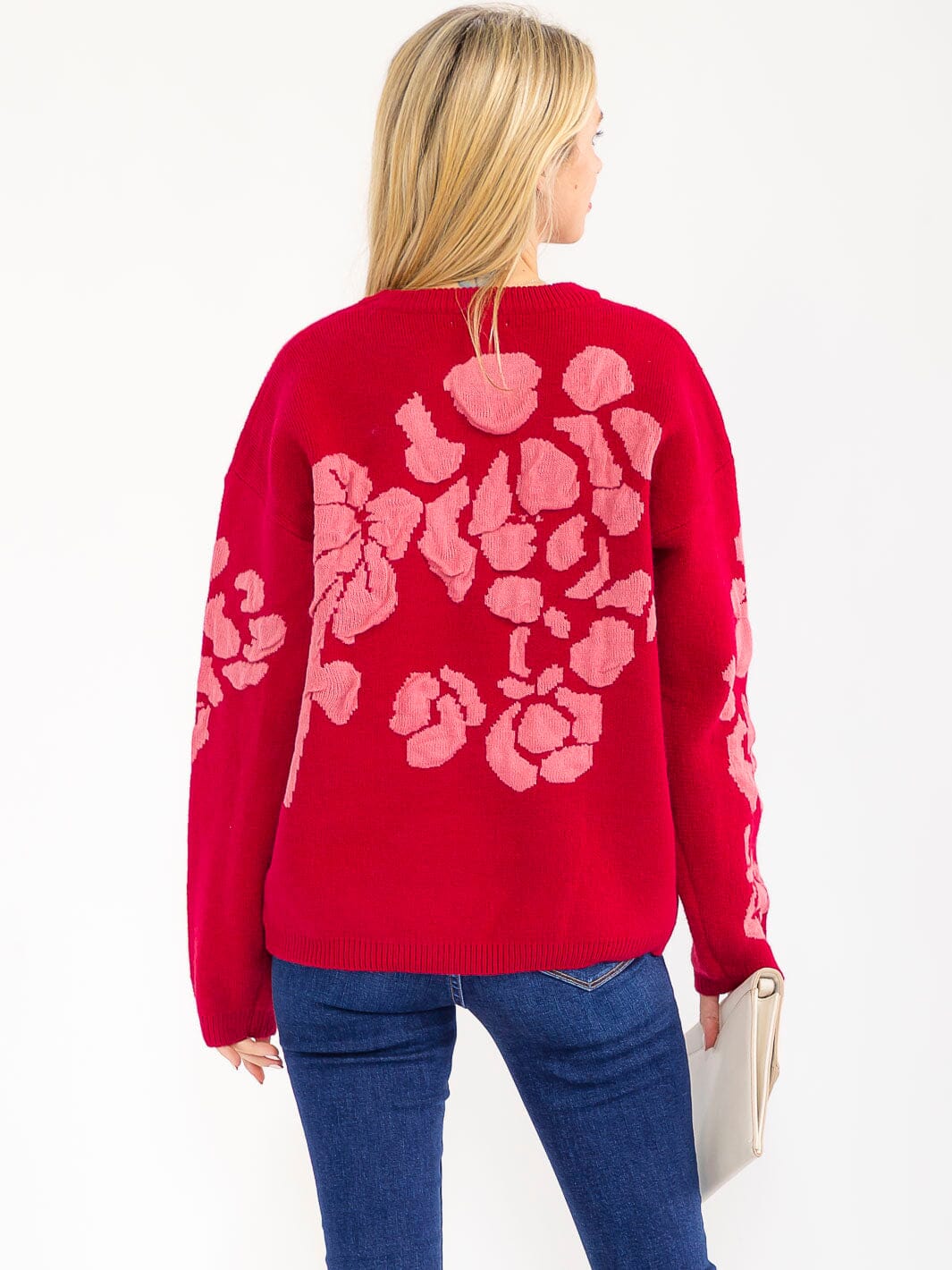 Features:Soft acrylic-polyester-nylon blend, relaxed standard fit, on-trend colorblock floral print, long sleeves for seasonal versatility, easy hand wash care, boutique-friendly price point, ideal for layering or solo styling