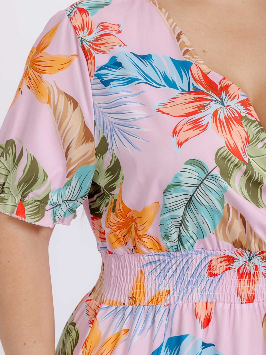 Features:Soft polyester blend, flattering smock waist, vibrant floral pattern, short sleeves, versatile styling options, perfect for spring and summer, curve-enhancing fit.