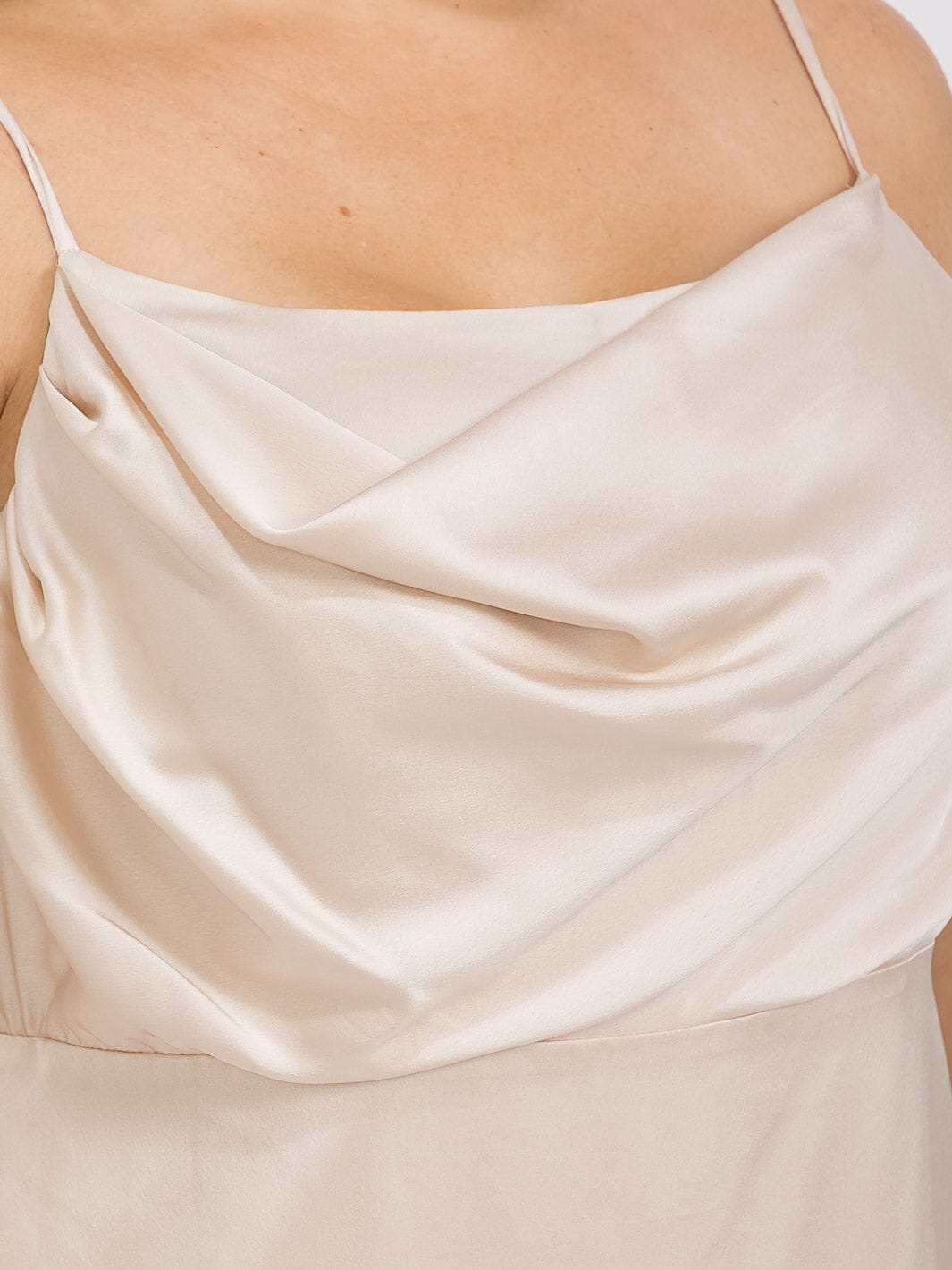 Polyester blend fabric, flattering cowl neck, sleeveless design, side slit for ease of movement, perfect for formal occasions, available in plus sizes, ideal for summer and spring events.