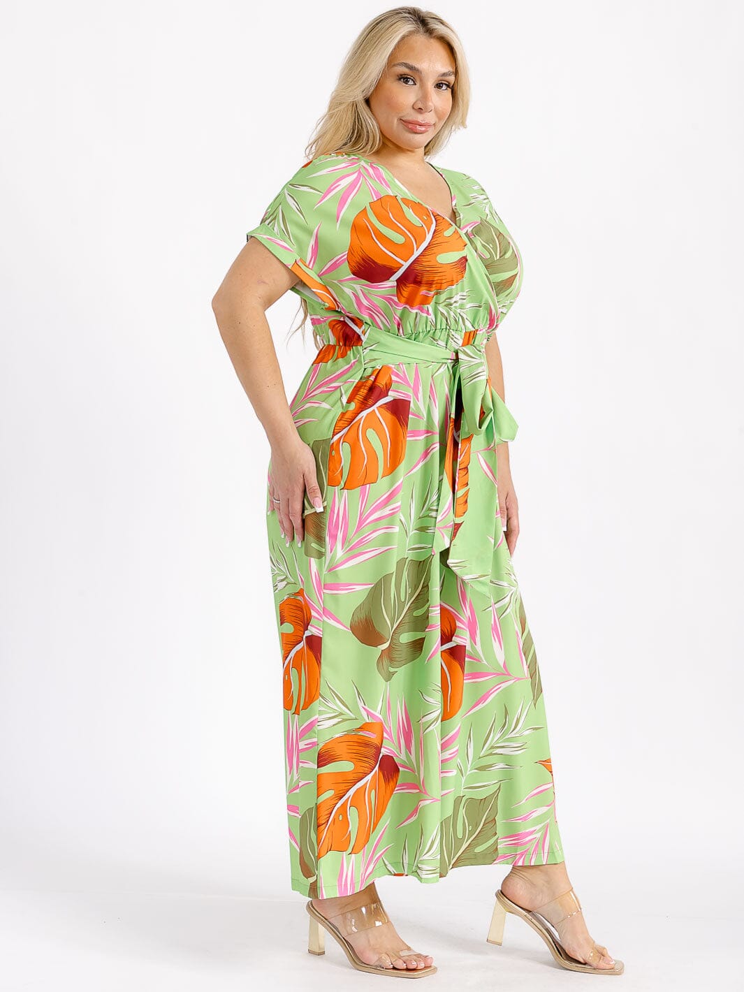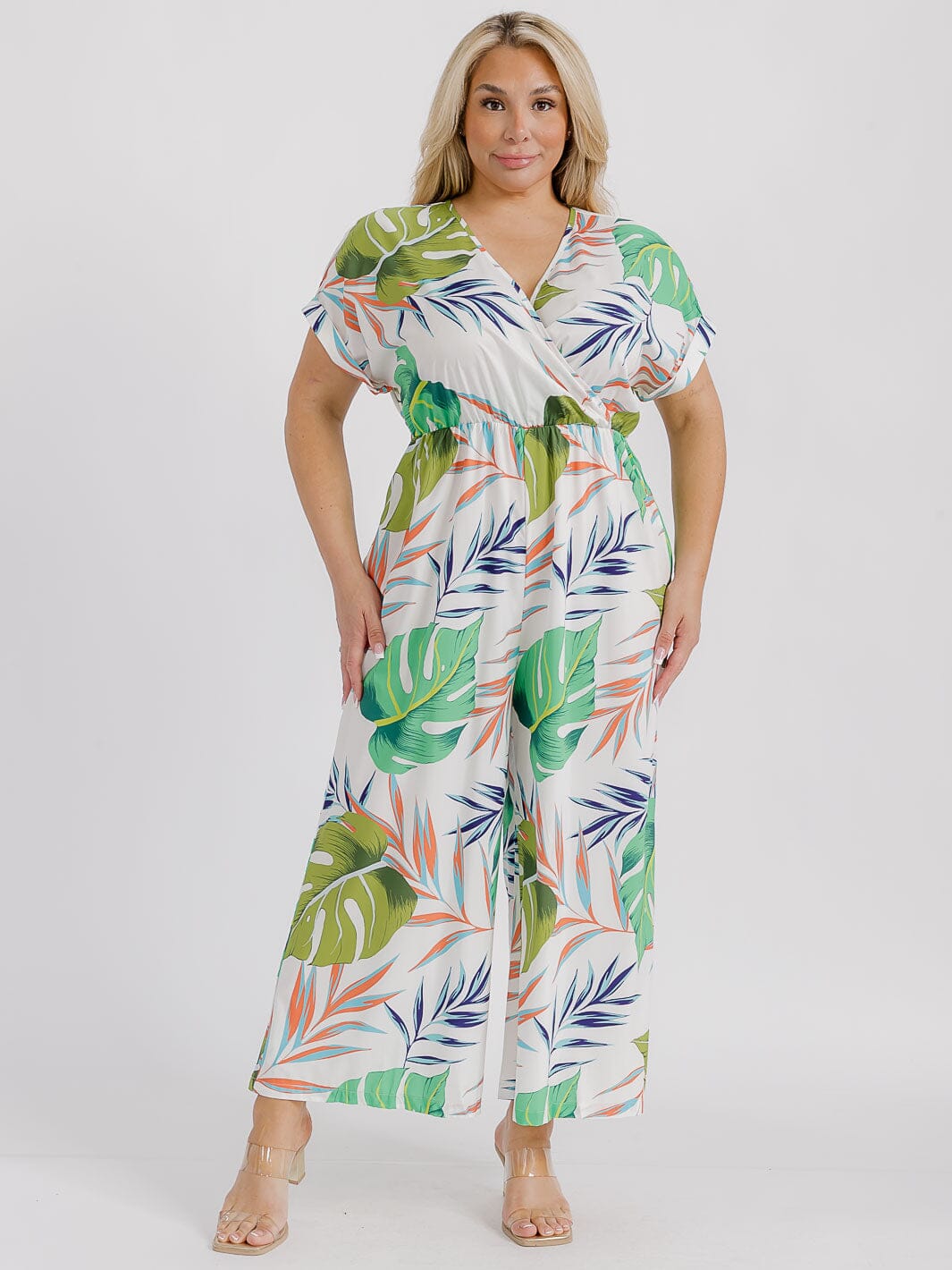 Discover the perfect blend of comfort and style with our plus-size leaf print wide-leg jumpsuit. Crafted from a soft, stretchy fabric, this piece features a flattering surplice neckline and an elastic waist that cinches for an elegant silhouette. Its vibrant leaf pattern makes it a standout choice for any occasion, ideal for daytime outings or casual evening gatherings. A must-have item for retailers seeking trend-forward pieces for their collection.