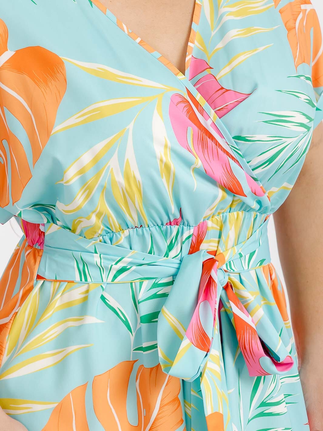 Complete the look:This plus-size surplice jumpsuit with vibrant leaf motifs is a favorite among boutiques for its stylish versatility and high-quality fabric. With its attractive price point, retailers can enjoy excellent markup potential while offering customers an on-trend piece that's perfect for seasonal transitions. Its bold design and adaptable styling options make it a standout item for in-store displays or online promotions, ensuring consistent customer interest and repeat orders.