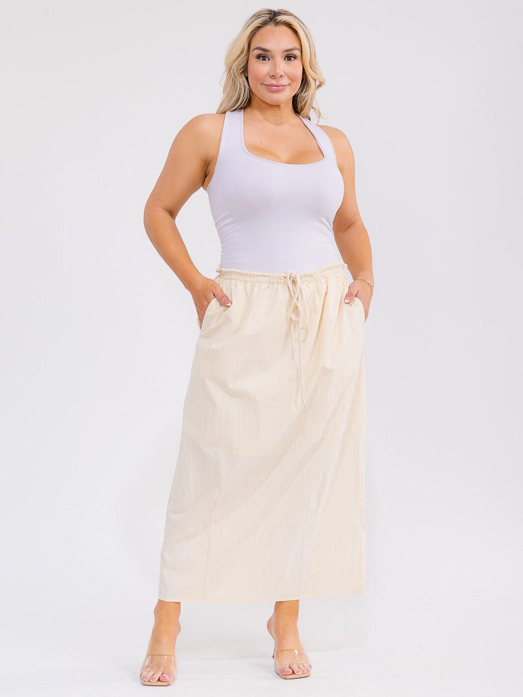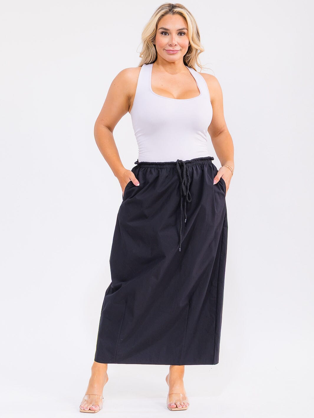 Complete the look:This elasticized waisted plus maxi skirt with pockets drives consistent sell-through thanks to its inclusive sizing and classic lines. Boutique buyers appreciate the low per-unit cost and flexible pack sizing, maximizing markup while minimizing risk. The timeless silhouette and color assortment make it a reliable core item for repeat orders, while versatile styling potential enhances in-store merchandising and online conversion. Perfect for expanding your plus size selection with a high-performing staple customers request season after season.
