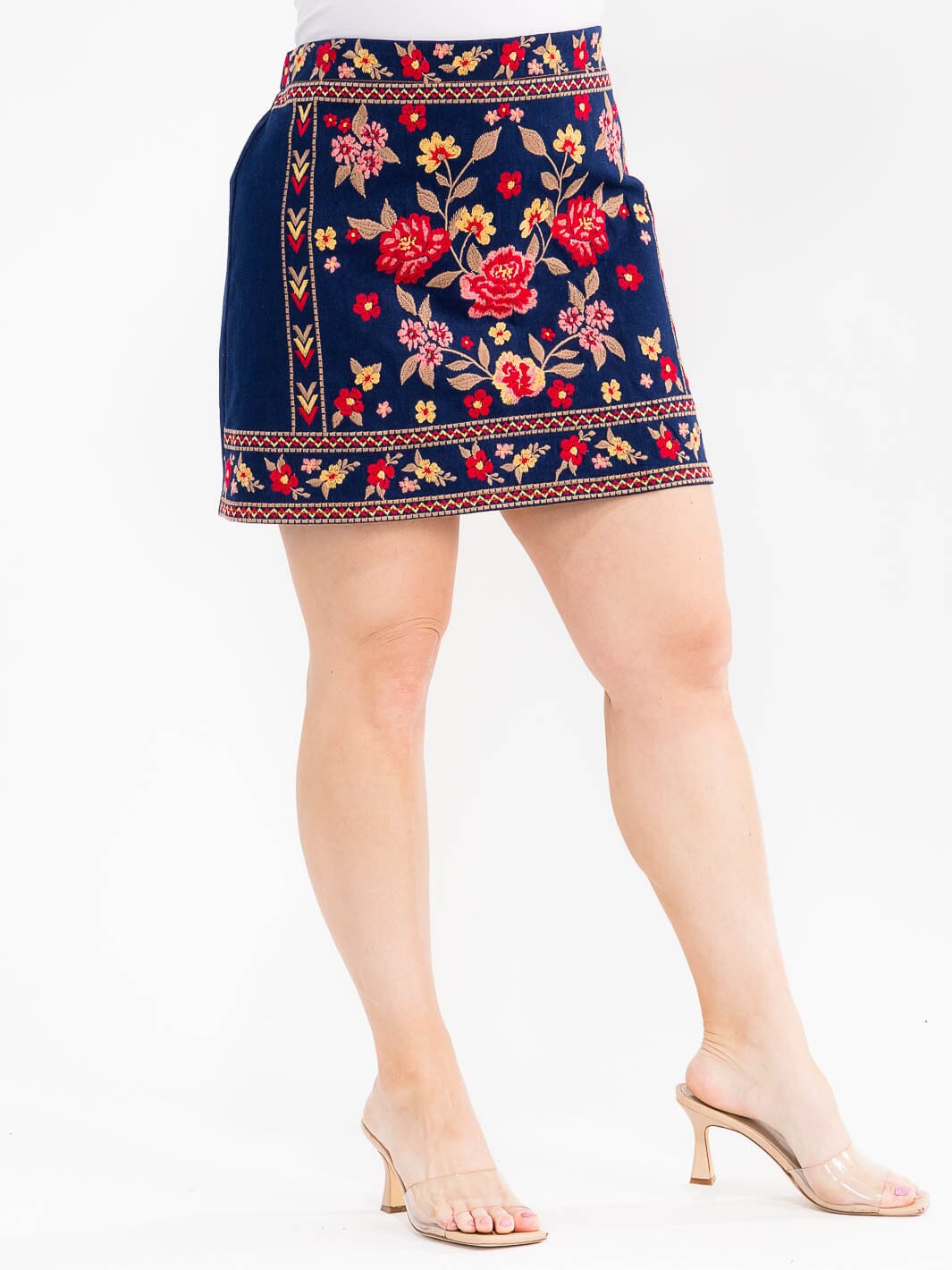Complete the look:This embroidered denim mini skirt is a perfect addition to any retailer's collection, offering a chic and versatile option for plus-size fashion. Boutiques love this piece for its high markup potential and consistent demand, thanks to its appealing design and reliable reorder rates. Ideal for both physical and online displays, it's a trend-forward option that draws customers in and keeps them coming back.