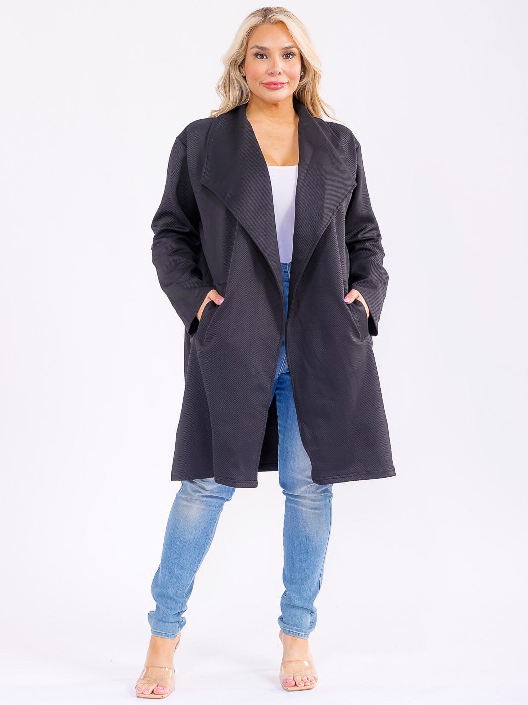 PLUS SIZE LONG SLEEVE OPEN FRONT POCKETS RIBBED COAT