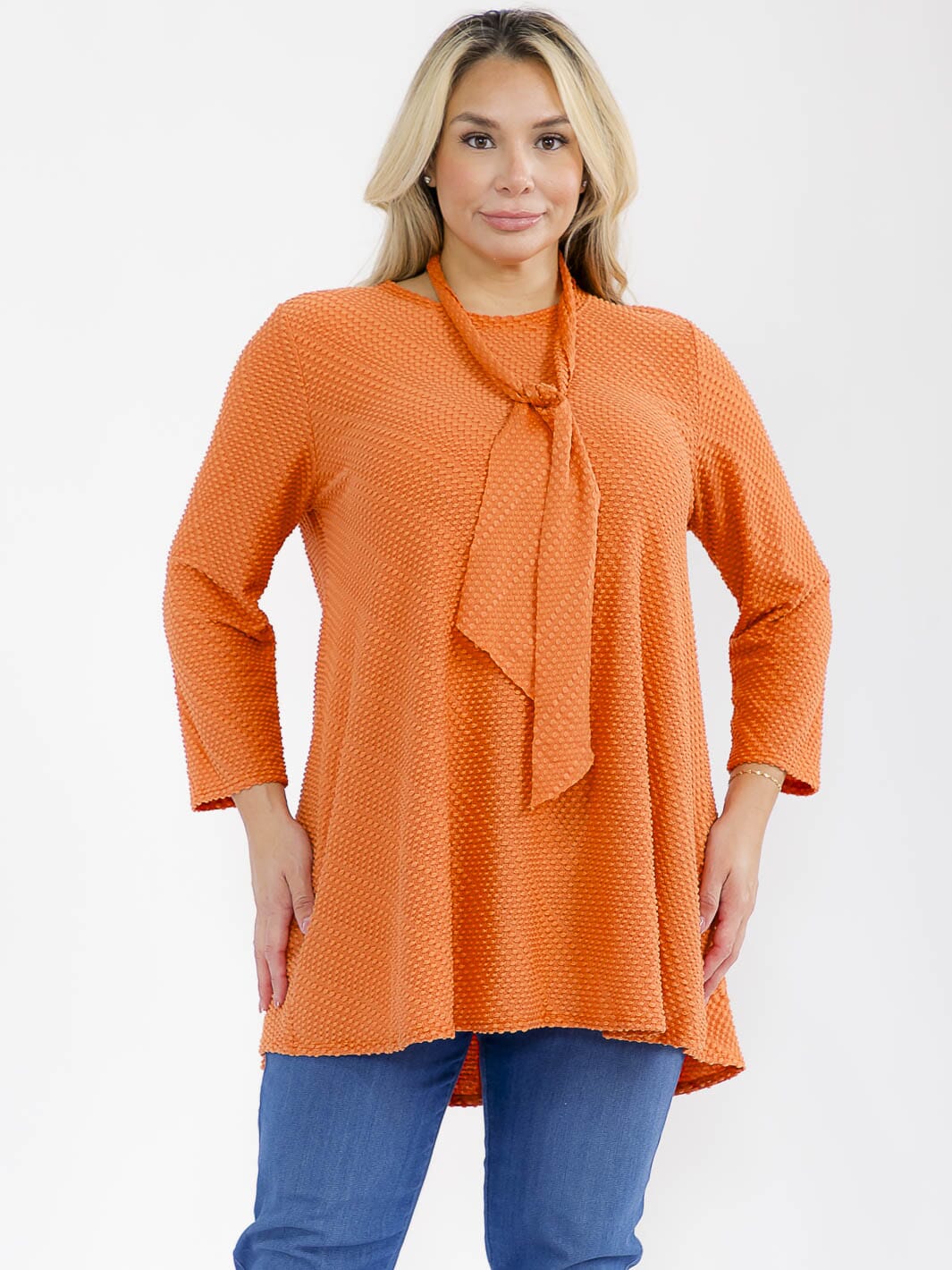 Discover the chic elegance of our Plus Size Tunic Blouse with 3/4 Sleeves and Scarf Detail. Crafted from a soft polyester-spandex blend, this tunic offers a flattering silhouette perfect for layering. With its versatile design, it transitions effortlessly from casual daywear to evening sophistication, making it a must-have for retailers seeking trend-forward pieces.