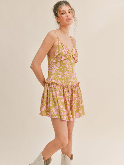 WOMEN'S SLEEVELESS V-NECK RUFFLE FLORAL MINI DRESS