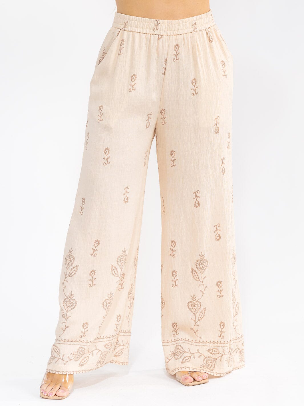 Soft rayon-nylon blend, flattering fit, comfortable elastic waist, embroidery detail, versatile styling options, perfect for year-round wear, boutique favorite.
