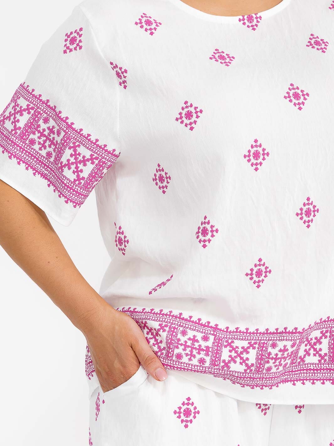 Elevate your plus size offering with this dynamic multi-print two-piece set featuring a short sleeve blouse and coordinating elastic waist pants. Cut from a soft rayon-chinlon blend, this ensemble offers both comfort and standout style with vibrant pattern options in magenta, taupe, blue, and beige. The relaxed-fit blouse and flowing pants are designed to flatter curves, making this set a trend-forward favorite for everyday wear or easy event outfitting. Perfect for boutiques seeking a versatile, bestselling set that transitions seamlessly from work to weekend.