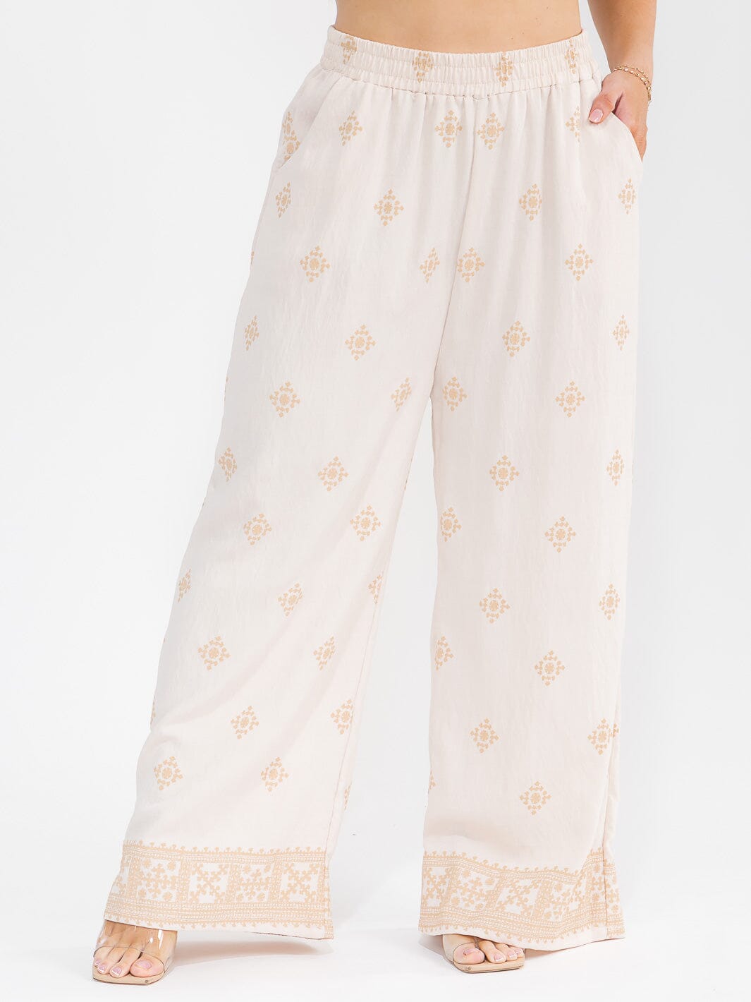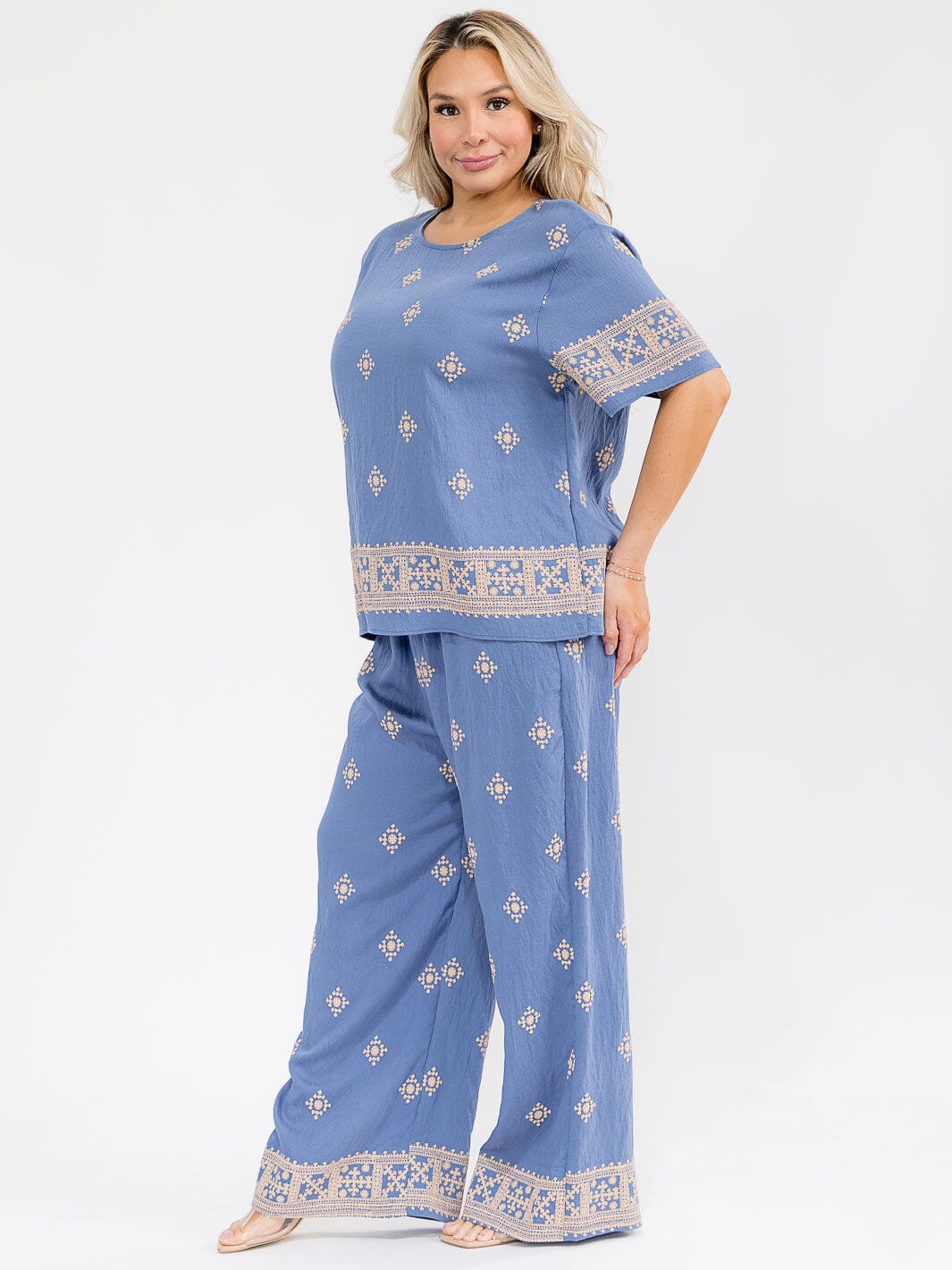 Silky-soft rayon blend fabric, relaxed and flattering silhouette, easy pull-on elastic waist pants, short sleeve top for versatility, bold multi-color prints, exclusive plus size fits (XL-3X), ideal for casual or dressy styling, perfect for spring and summer assortments
