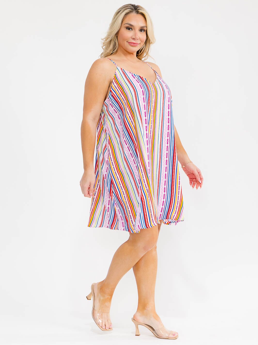 Features:Allover multi print, sleeveless V-neckline, easy mini length for versatile styling, lightweight 100% rayon fabric with polyester lining, flattering fit for plus sizes, suitable for spring and summer, appealing for boutique merchandising.