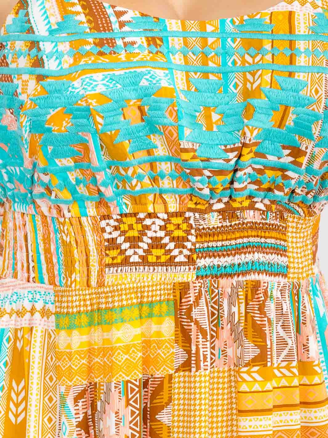 Inclusive sizing options, lightweight rayon fabric, trend-forward multi-print design, smock waist for comfort, versatile styling opportunities, boutique bestseller appeal, easy-care fabric.