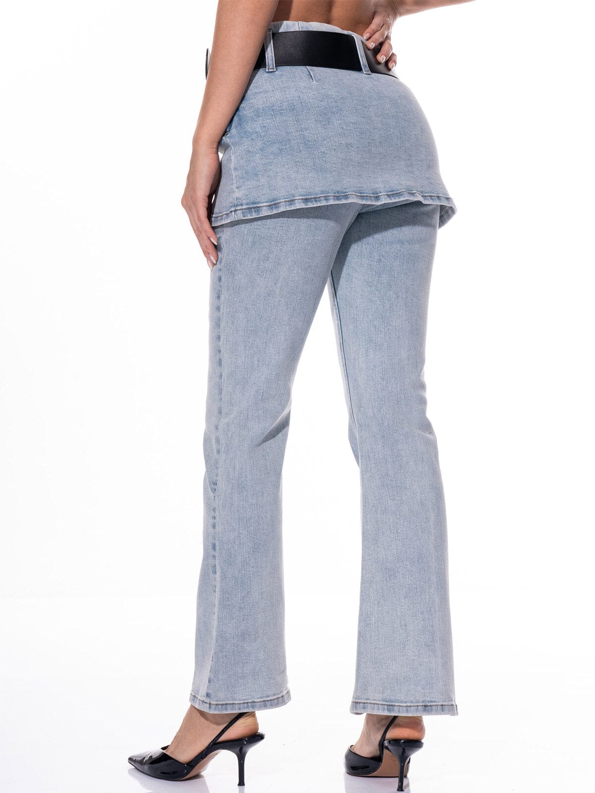 Features:High-stretch cotton denim, overlay skirt design, zip-up front closure, removable belt for adjustable fit, dramatic bell legs, on-trend silhouette, boutique-friendly pack sizing