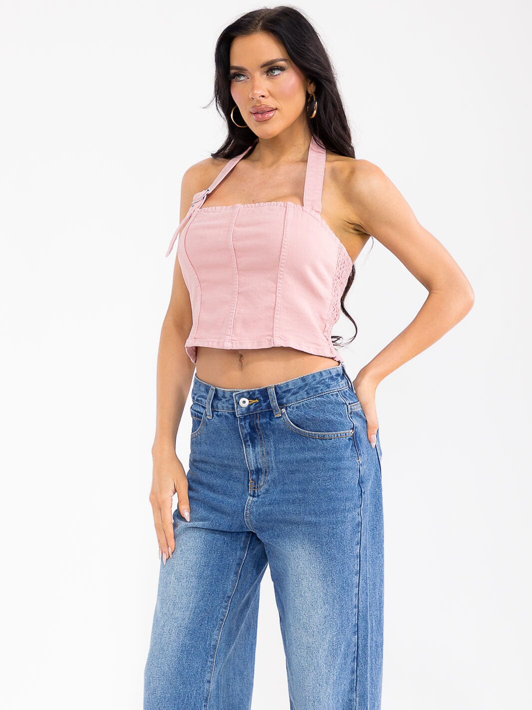WOMEN'S SLEEVELESS HALTER NECK OPEN BACK SMOCK DENIM CROP TOP