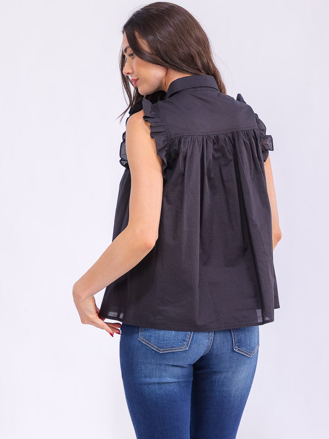 Ruffle sleeve detail, premium 99% cotton blend with tencel, soft 100% rayon lining, button-up front closure, versatile tunic length, lightweight and breathable, must-have for boutique curations