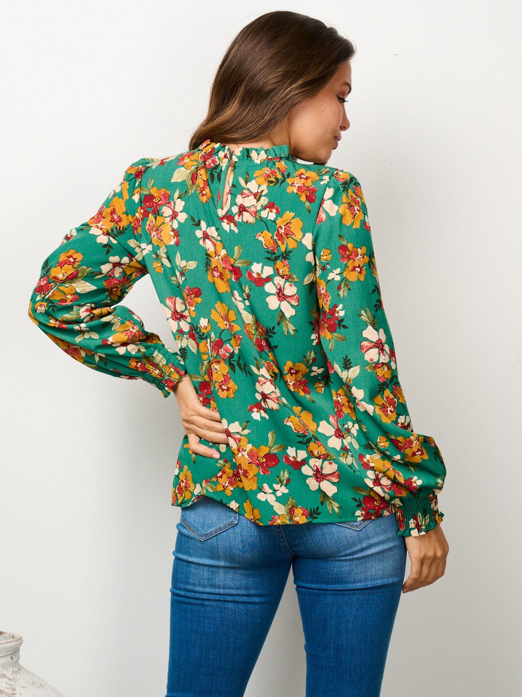 Complete the look:Women's long sleeve mock neck floral blouse top is a popular choice among boutiques due to its high markup potential, reliability in reorders, trend appeal, and eye-catching display value both in-store and online. Made in USA with high-quality materials, this top is a must-have for retailers looking to add a stylish and versatile piece to their collection. Don't miss out on this top-selling item that is sure to fly off the shelves and bring in repeat customers.