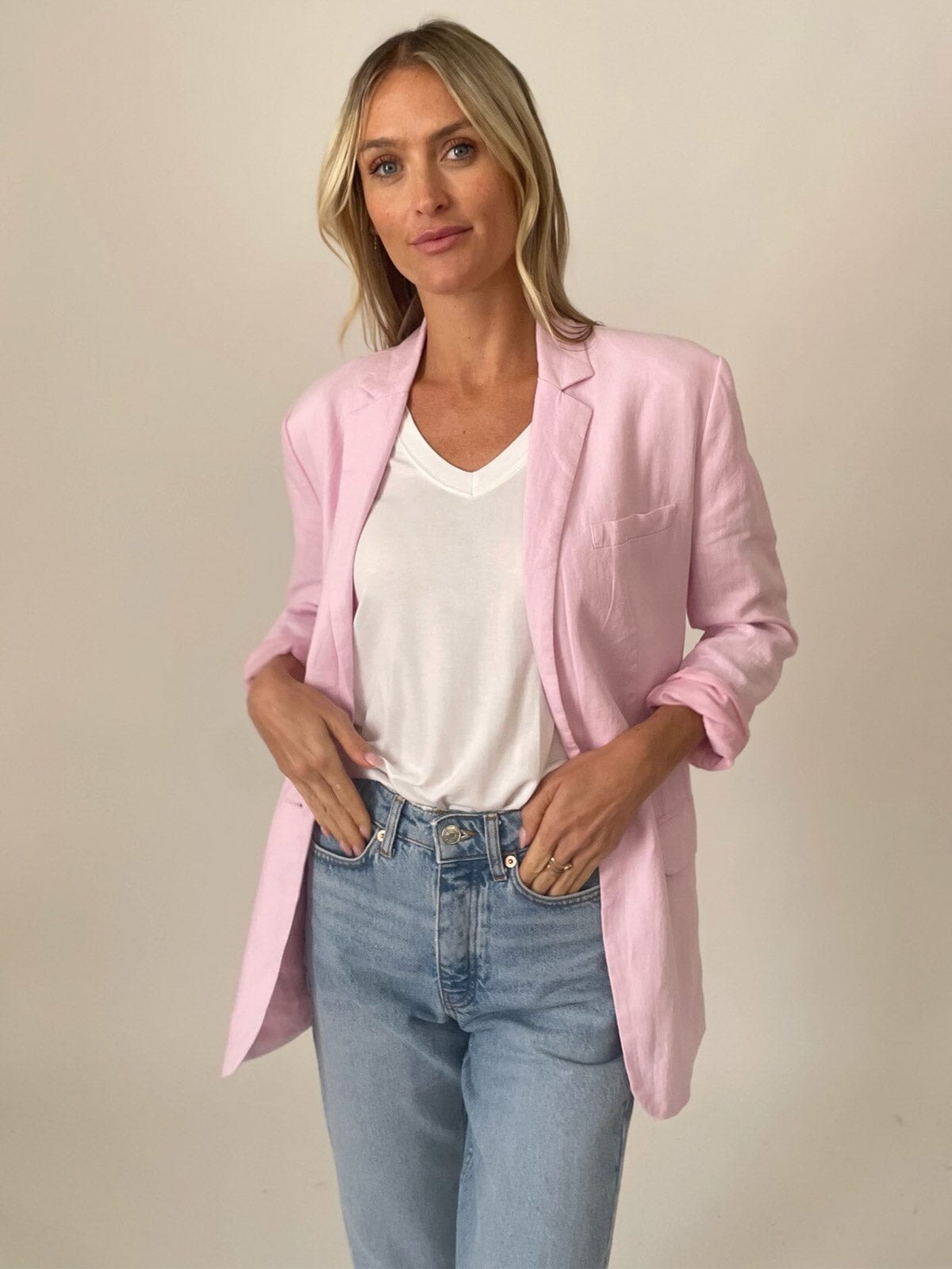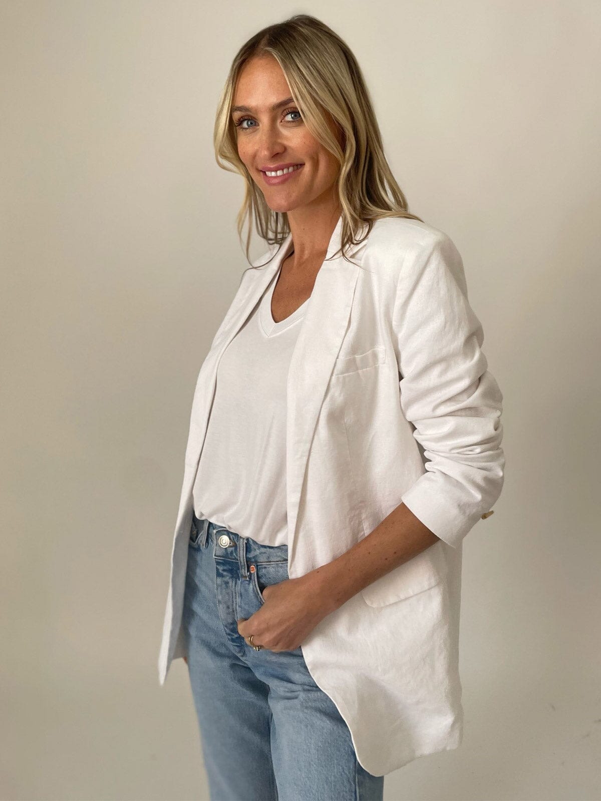 Features:Luxurious linen blend, tailored fit, versatile styling, perfect for layering, ideal for year-round wear, boutique appeal, practical pockets.