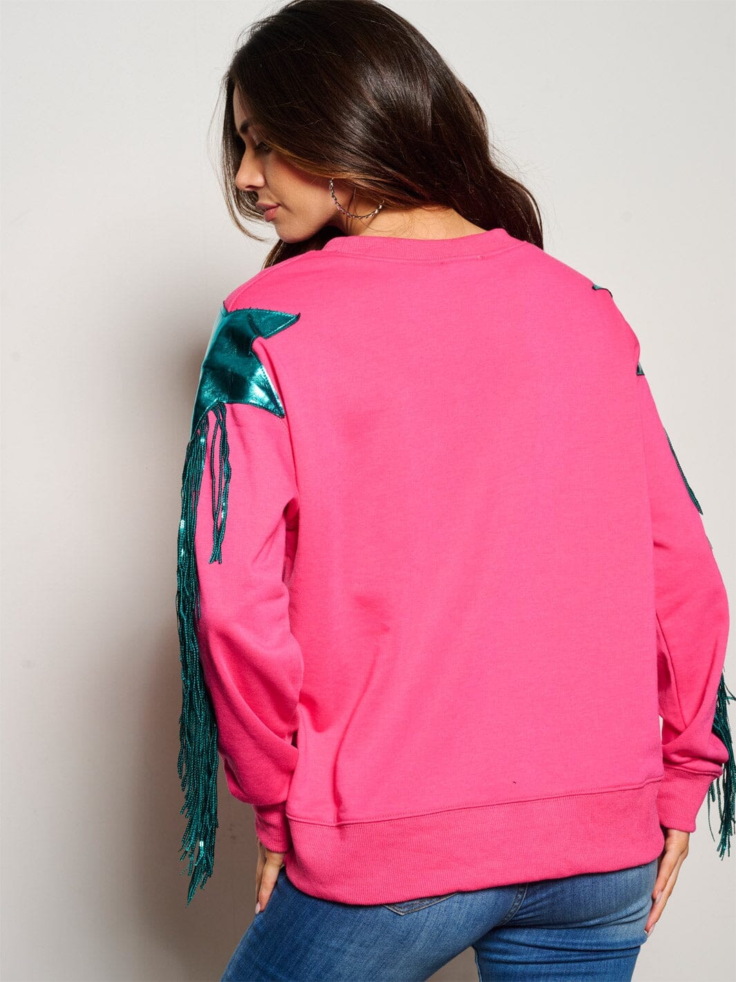 Complete the look:The WOMEN'S LONG SLEEVE FRINGE STARS SEQUINS DETAILED SWEATER is a top seller for boutiques due to its versatile design and high-quality material. Retailers can markup the sweater for a solid profit margin, and the trend-forward details make it a reliable item that customers will continue to reorder. The sweater also has great display value, both in-store and online, making it a must-have for any boutique looking to offer on-trend, high-quality pieces to their customers. Stock up on this sweater now to attract fashion-forward customers and boost your boutique's sales!