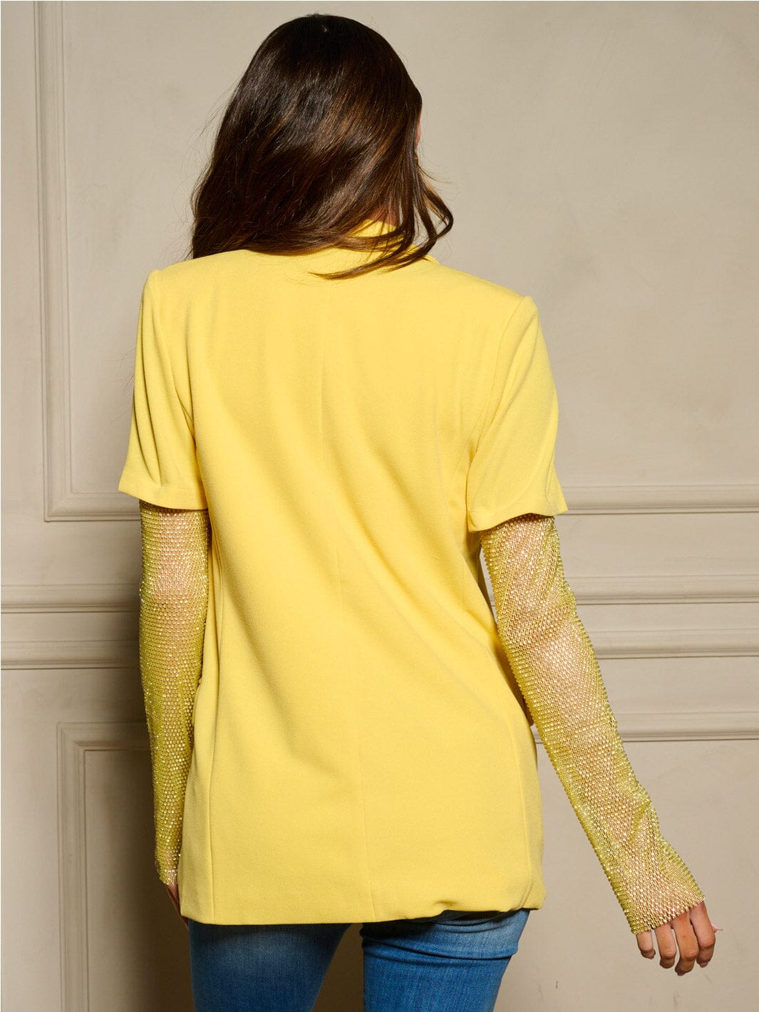 The WOMEN'S LONG MESH STUDS SLEEVE OPEN FRONT BLAZER is the perfect statement piece for any trend-forward boutique. Made with a blend of 95% Polyester and 5% Spandex, this blazer offers a comfortable and flattering fit, ideal for layering over any outfit. The open front design and mesh stud sleeves add a touch of edginess to this classic silhouette, making it a must-have for retailers looking to offer their customers the latest fashion trends.